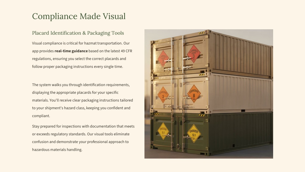 Compliance Made Visual Placard Identification & Packaging Tools Visual compliance is critical for hazmat transportation. Our app provides real-time guidance based on the latest 49 CFR regulations, ensuring you select the correct placards and follow proper packaging instructions every single time. The system walks you through identification requirements, displaying the appropriate placards for your specific materials. You'll receive clear packaging instructions tailored to your shipment's hazard class, keeping you confident and compliant. Stay prepared for inspections with documentation that meets or exceeds regulatory standards. Our visual tools eliminate confusion and demonstrate your professional approach to hazardous materials handling.