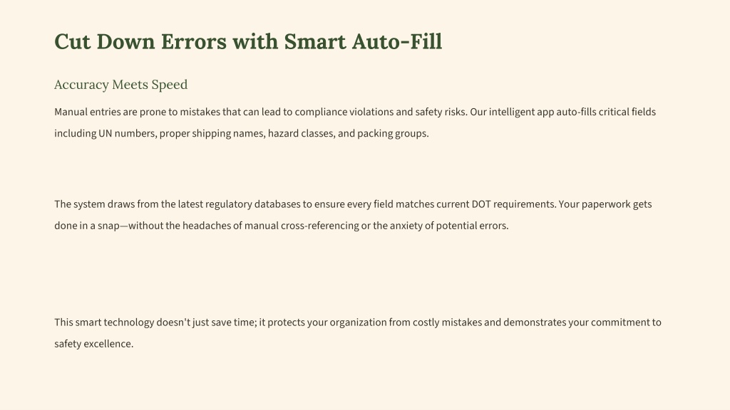 Cut Down Errors with Smart Auto-Fill Accuracy Meets Speed Manual entries are prone to mistakes that can lead to compliance violations and safety risks. Our intelligent app auto-fills critical fields including UN numbers, proper shipping names, hazard classes, and packing groups. The system draws from the latest regulatory databases to ensure every field matches current DOT requirements. Your paperwork gets done in a snap—without the headaches of manual cross-referencing or the anxiety of potential errors. This smart technology doesn't just save time; it protects your organization from costly mistakes and demonstrates your commitment to safety excellence.