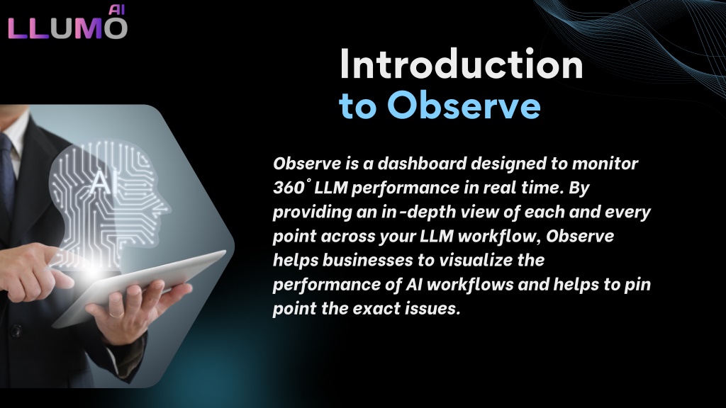 Introduction to Observe Observe is a dashboard designed to monitor 360° LLM performance in real time. By providing an in-depth view of each and every point across your LLM workflow, Observe helps businesses to visualize the performance of AI workflows and helps to pin point the exact issues.