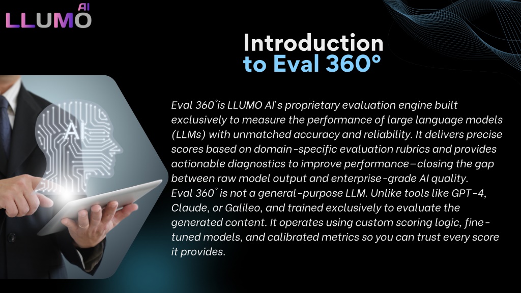 Introduction to Eval 360° Eval 360°is LLUMO AI’s proprietary evaluation engine built exclusively to measure the performance of large language models (LLMs) with unmatched accuracy and reliability. It delivers precise scores based on domain-specific evaluation rubrics and provides actionable diagnostics to improve performance—closing the gap between raw model output and enterprise-grade AI quality. Eval 360° is not a general-purpose LLM. Unlike tools like GPT-4, Claude, or Galileo, and trained exclusively to evaluate the generated content. It operates using custom scoring logic, fine- tuned models, and calibrated metrics so you can trust every score it provides.