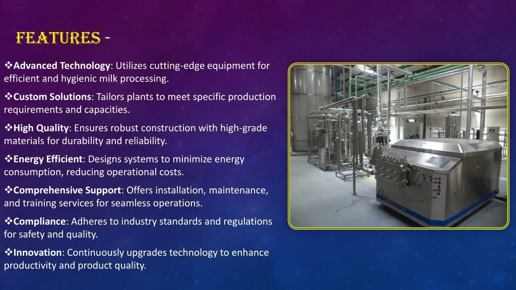 FEATURES - Advanced Technology: Utilizes cutting-edge equipment for efficient and hygienic milk processing. Custom Solutions: Tailors plants to meet specific production requirements and capacities. High Quality: Ensures robust construction with high-grade materials for durability and reliability. Energy Efficient: Designs systems to minimize energy consumption, reducing operational costs. Comprehensive Support: Offers installation, maintenance, and training services for seamless operations. Compliance: Adheres to industry standards and regulations for safety and quality. Innovation: Continuously upgrades technology to enhance productivity and product quality.