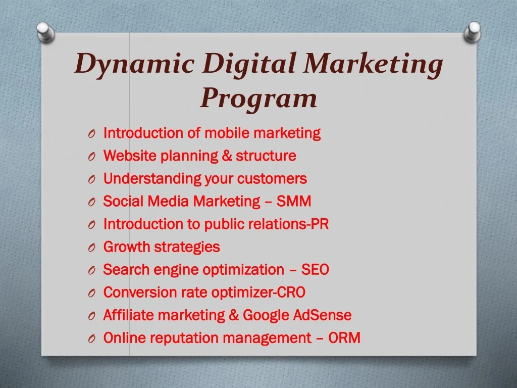 Dynamic Digital Marketing Program • Introduction of mobile marketing • Website planning & structure • Understanding your customers • Social Media Marketing – SMM • Introduction to public relations-PR • Growth strategies • Search engine optimization – SEO • Conversion rate optimizer-CRO • Affiliate marketing & Google AdSense • Online reputation management – ORM