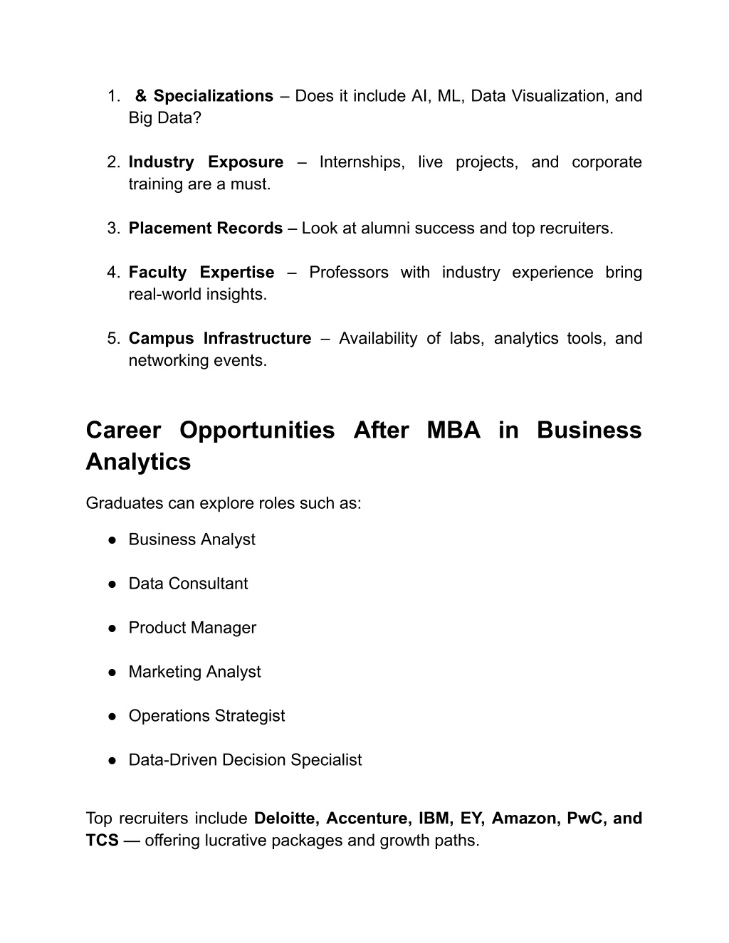 1. & Specializations – Does it include AI, ML, Data Visualization, and Big Data? 2. Industry Exposure – Internships, live projects, and corporate training are a must. 3. Placement Records – Look at alumni success and top recruiters. 4. Faculty Expertise – Professors with industry experience bring real-world insights. 5. Campus Infrastructure – Availability of labs, analytics tools, and networking events. Career Opportunities After MBA in Business Analytics Graduates can explore roles such as: ● Business Analyst ● Data Consultant ● Product Manager ● Marketing Analyst ● Operations Strategist ● Data-Driven Decision Specialist Top recruiters include Deloitte, Accenture, IBM, EY, Amazon, PwC, and TCS — offering lucrative packages and growth paths.