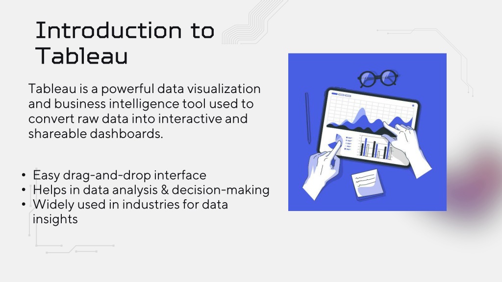 2. Introduction to Tableau Tableau is a powerful data visualization and business intelligence tool used to convert raw data into interactive and shareable dashboards. • Easy drag-and-drop interface • Helps in data analysis & decision-making • Widely used in industries for data insights