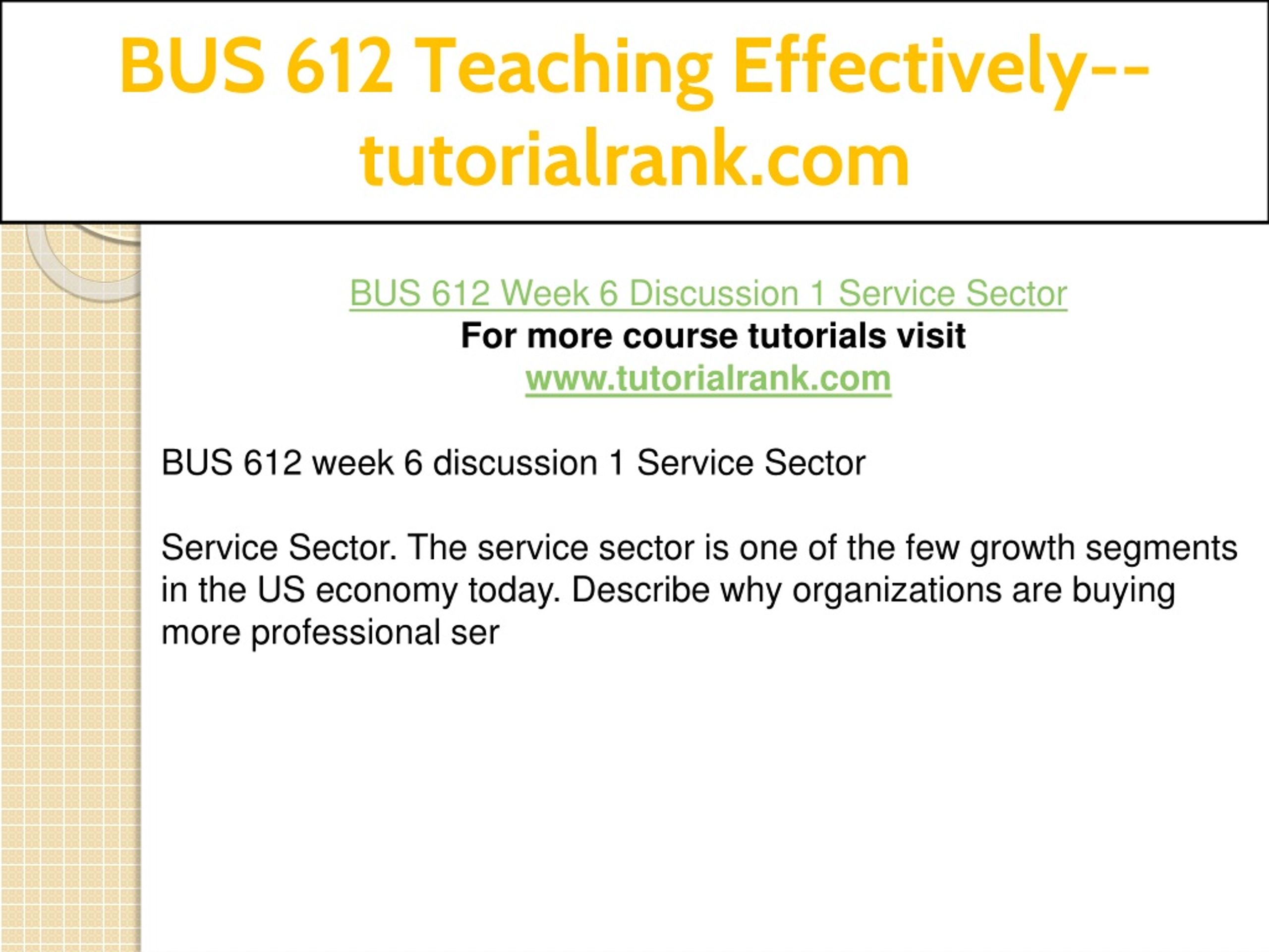 BUS 612 Teaching Effectively--tutorialrank.com BUS 612 Week 6 Discussion 1 Service Sector For more course tutorials visit www.tutorialrank.com BUS 612 week 6 discussion 1 Service Sector Service Sector. The service sector is one of the few growth segments in the US economy today. Describe why organizations are buying more professional ser