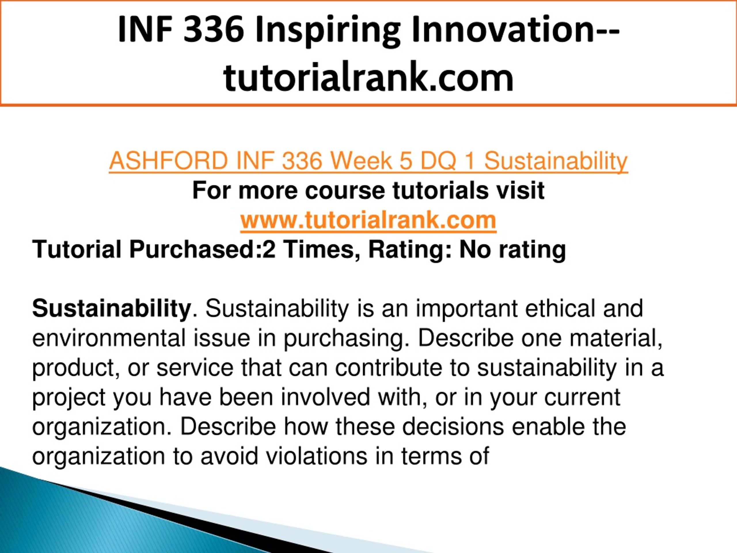 INF 336 Inspiring Innovation-- tutorialrank.com ASHFORD INF 336 Week 5 DQ 1 Sustainability For more course tutorials visit www.tutorialrank.com Tutorial Purchased:2 Times, Rating: No rating Sustainability. Sustainability is an important ethical and environmental issue in purchasing. Describe one material, product, or service that can contribute to sustainability in a project you have been involved with, or in your current organization. Describe how these decisions enable the organization to avoid violations in terms of