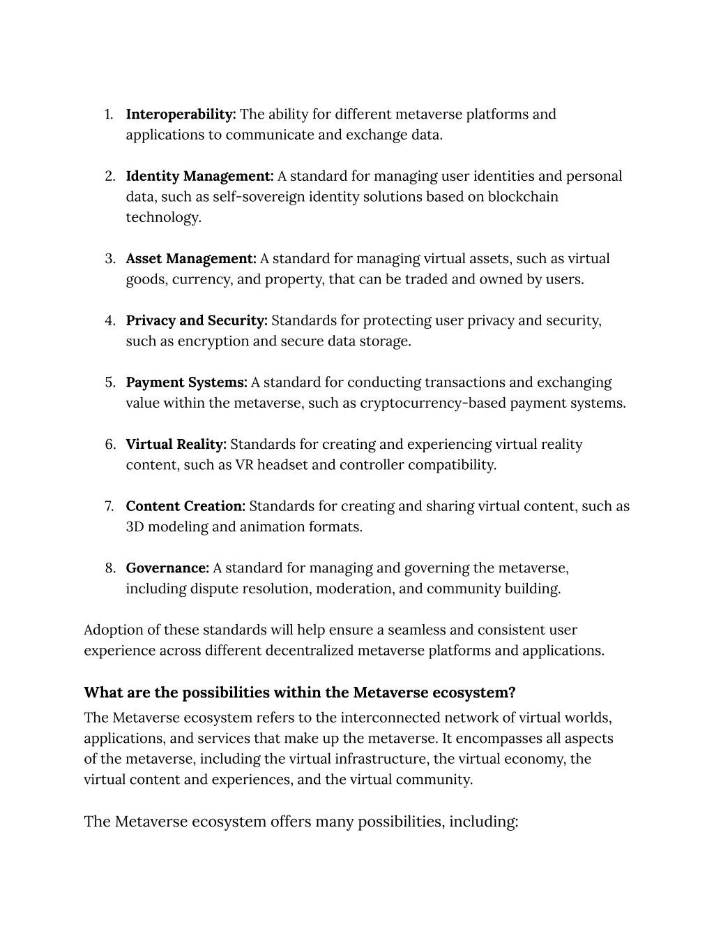 1. Interoperability: The ability for different metaverse platforms and applications to communicate and exchange data. 2. Identity Management: A standard for managing user identities and personal data, such as self-sovereign identity solutions based on blockchain technology. 3. Asset Management: A standard for managing virtual assets, such as virtual goods, currency, and property, that can be traded and owned by users. 4. Privacy and Security: Standards for protecting user privacy and security, such as encryption and secure data storage. 5. Payment Systems: A standard for conducting transactions and exchanging value within the metaverse, such as cryptocurrency-based payment systems. 6. Virtual Reality: Standards for creating and experiencing virtual reality content, such as VR headset and controller compatibility. 7. Content Creation: Standards for creating and sharing virtual content, such as 3D modeling and animation formats. 8. Governance: A standard for managing and governing the metaverse, including dispute resolution, moderation, and community building. Adoption of these standards will help ensure a seamless and consistent user experience across different decentralized metaverse platforms and applications. What are the possibilities within the Metaverse ecosystem? The Metaverse ecosystem refers to the interconnected network of virtual worlds, applications, and services that make up the metaverse. It encompasses all aspects of the metaverse, including the virtual infrastructure, the virtual economy, the virtual content and experiences, and the virtual community. The Metaverse ecosystem offers many possibilities, including:
