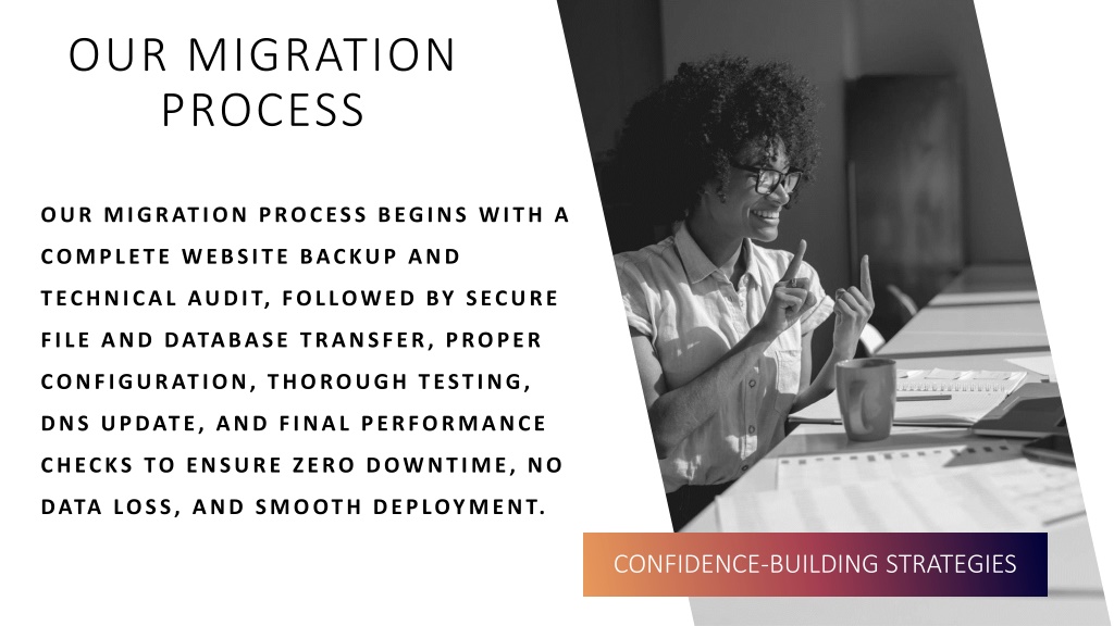 Our Migration Process Our migration process begins with a complete website backup and technical audit, followed by secure file and database transfer, proper configuration, thorough testing, DNS update, and final performance checks to ensure zero downtime, no data loss, and smooth deployment. CONFIDENCE-BUILDING STRATEGIES