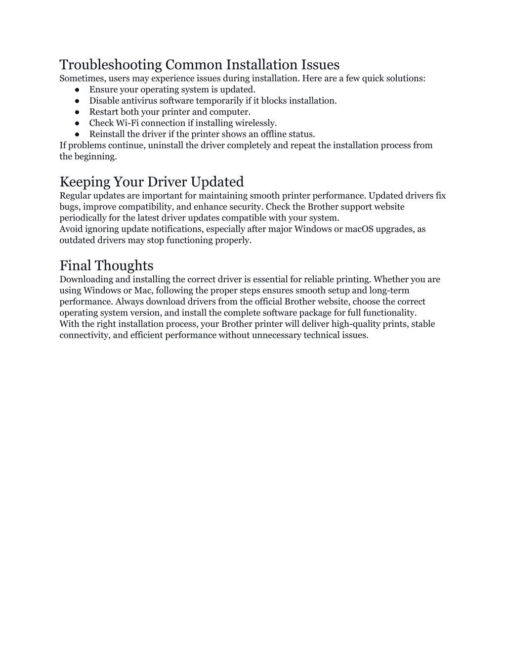 Troubleshooting Common Installation Issues Sometimes, users may experience issues during installation. Here are a few quick solutions: ● Ensure your operating system is updated. ● Disable antivirus software temporarily if it blocks installation. ● Restart both your printer and computer. ● Check Wi-Fi connection if installing wirelessly. ● Reinstall the driver if the printer shows an offline status. If problems continue, uninstall the driver completely and repeat the installation process from the beginning. Keeping Your Driver Updated Regular updates are important for maintaining smooth printer performance. Updated drivers fix bugs, improve compatibility, and enhance security. Check the Brother support website periodically for the latest driver updates compatible with your system. Avoid ignoring update notifications, especially after major Windows or macOS upgrades, as outdated drivers may stop functioning properly. Final Thoughts Downloading and installing the correct driver is essential for reliable printing. Whether you are using Windows or Mac, following the proper steps ensures smooth setup and long-term performance. Always download drivers from the official Brother website, choose the correct operating system version, and install the complete software package for full functionality. With the right installation process, your Brother printer will deliver high-quality prints, stable connectivity, and efficient performance without unnecessary technical issues.