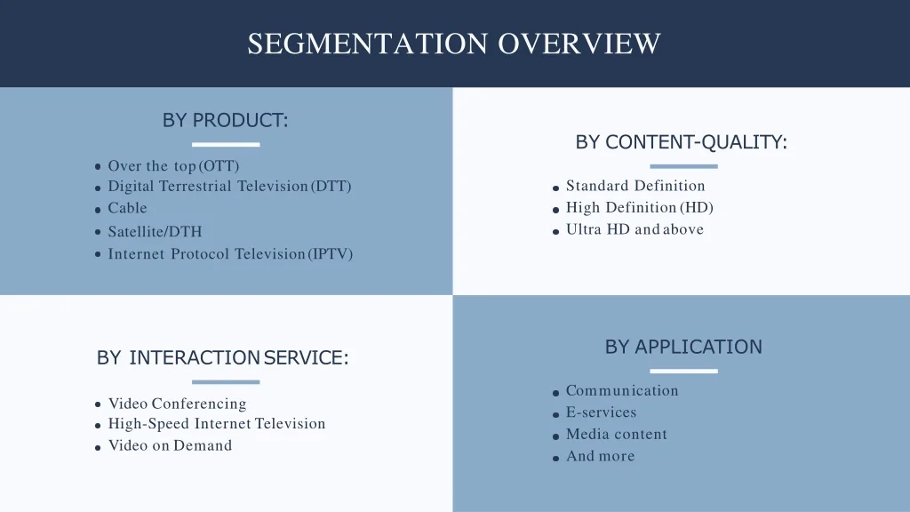 SEGMENTATIONOVERVIEW BYPRODUCT: Over the top(OTT) Digital Terrestrial Television(DTT) Cable Satellite/DTH Internet Protocol Television(IPTV) BYCONTENT-QUALITY: Standard Definition High Definition(HD) Ultra HD andabove BYAPPLICATION Communication E-services Media content Andmore BY INTERACTIONSERVICE: VideoConferencing High-Speed InternetTelevision Video onDemand