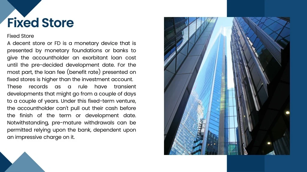 Fixed Store Fixed Store A decent store or FD is a monetary device that is presented by monetary foundations or banks to give the accountholder an exorbitant loan cost until the pre-decided development date. For the most part, the loan fee (benefit rate) presented on fixed stores is higher than the investment account. These records as a rule have transient developments that might go from a couple of days to a couple of years. Under this fixed-term venture, the accountholder can't pull out their cash before the finish of the term or development date. Notwithstanding, pre-mature withdrawals can be permitted relying upon the bank, dependent upon an impressive charge on it.
