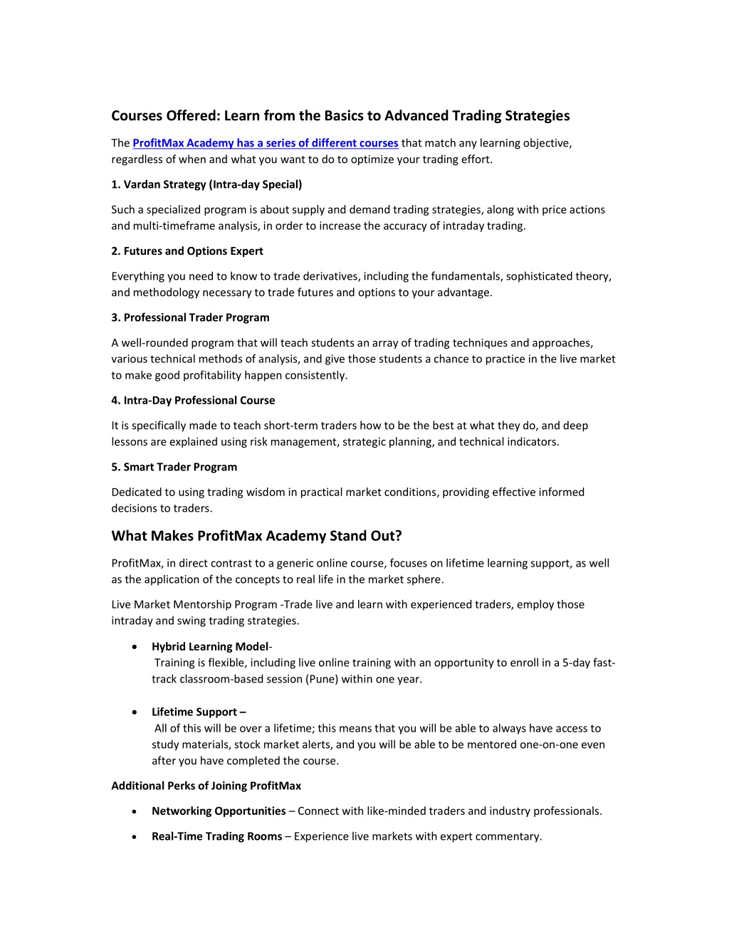 Courses Offered: Learn from the Basics to Advanced Trading Strategies The ProfitMax Academy has a series of different courses that match any learning objective, regardless of when and what you want to do to optimize your trading effort. 1. Vardan Strategy (Intra-day Special) Such a specialized program is about supply and demand trading strategies, along with price actions and multi-timeframe analysis, in order to increase the accuracy of intraday trading. 2. Futures and Options Expert Everything you need to know to trade derivatives, including the fundamentals, sophisticated theory, and methodology necessary to trade futures and options to your advantage. 3. Professional Trader Program A well-rounded program that will teach students an array of trading techniques and approaches, various technical methods of analysis, and give those students a chance to practice in the live market to make good profitability happen consistently. 4. Intra-Day Professional Course It is specifically made to teach short-term traders how to be the best at what they do, and deep lessons are explained using risk management, strategic planning, and technical indicators. 5. Smart Trader Program Dedicated to using trading wisdom in practical market conditions, providing effective informed decisions to traders. What Makes ProfitMax Academy Stand Out? ProfitMax, in direct contrast to a generic online course, focuses on lifetime learning support, as well as the application of the concepts to real life in the market sphere. Live Market Mentorship Program -Trade live and learn with experienced traders, employ those intraday and swing trading strategies. Hybrid Learning Model- Training is flexible, including live online training with an opportunity to enroll in a 5-day fast- track classroom-based session (Pune) within one year. Lifetime Support – All of this will be over a lifetime; this means that you will be able to always have access to study materials, stock market alerts, and you will be able to be mentored one-on-one even after you have completed the course. Additional Perks of Joining ProfitMax Networking Opportunities – Connect with like-minded traders and industry professionals. Real-Time Trading Rooms – Experience live markets with expert commentary.
