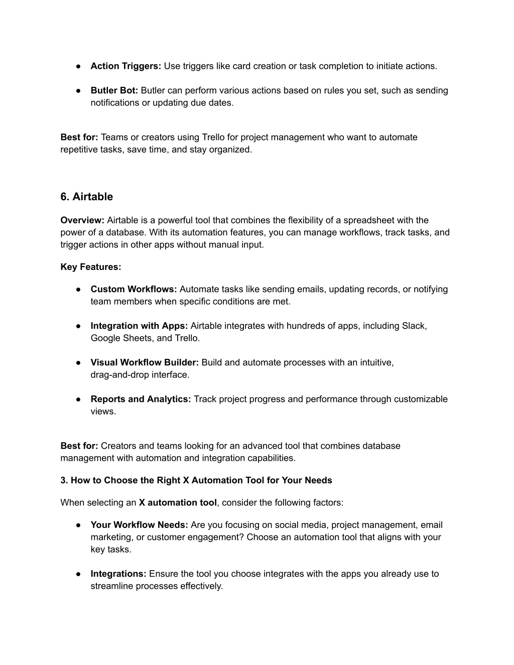 ● Action Triggers: Use triggers like card creation or task completion to initiate actions. ● Butler Bot: Butler can perform various actions based on rules you set, such as sending notifications or updating due dates. Best for: Teams or creators using Trello for project management who want to automate repetitive tasks, save time, and stay organized. 6. Airtable Overview: Airtable is a powerful tool that combines the flexibility of a spreadsheet with the power of a database. With its automation features, you can manage workflows, track tasks, and trigger actions in other apps without manual input. Key Features: ● Custom Workflows: Automate tasks like sending emails, updating records, or notifying team members when specific conditions are met. ● Integration with Apps: Airtable integrates with hundreds of apps, including Slack, Google Sheets, and Trello. ● Visual Workflow Builder: Build and automate processes with an intuitive, drag-and-drop interface. ● Reports and Analytics: Track project progress and performance through customizable views. Best for: Creators and teams looking for an advanced tool that combines database management with automation and integration capabilities. 3. How to Choose the Right X Automation Tool for Your Needs When selecting an X automation tool, consider the following factors: ● Your Workflow Needs: Are you focusing on social media, project management, email marketing, or customer engagement? Choose an automation tool that aligns with your key tasks. ● Integrations: Ensure the tool you choose integrates with the apps you already use to streamline processes effectively.