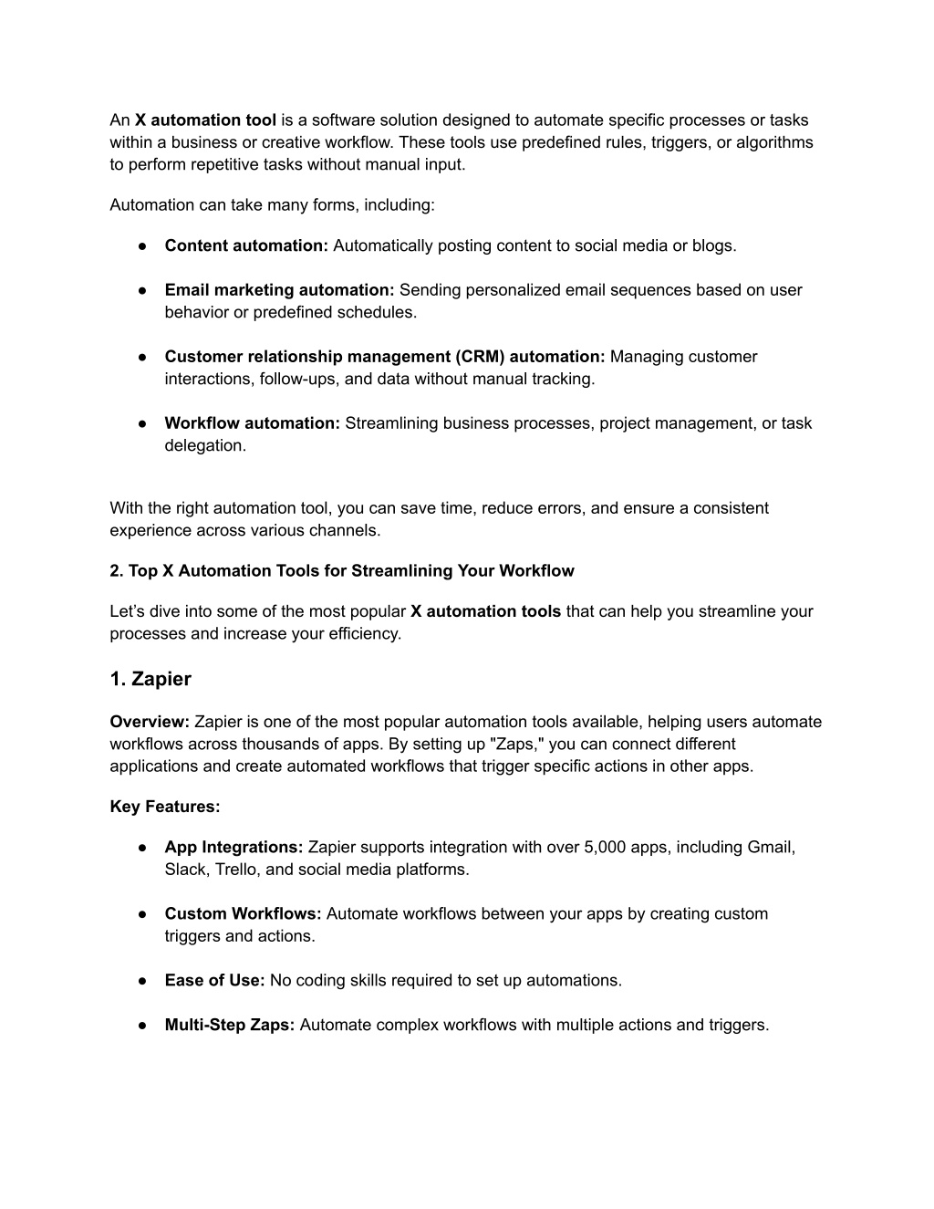 An X automation tool is a software solution designed to automate specific processes or tasks within a business or creative workflow. These tools use predefined rules, triggers, or algorithms to perform repetitive tasks without manual input. Automation can take many forms, including: ● Content automation: Automatically posting content to social media or blogs. ● Email marketing automation: Sending personalized email sequences based on user behavior or predefined schedules. ● Customer relationship management (CRM) automation: Managing customer interactions, follow-ups, and data without manual tracking. ● Workflow automation: Streamlining business processes, project management, or task delegation. With the right automation tool, you can save time, reduce errors, and ensure a consistent experience across various channels. 2. Top X Automation Tools for Streamlining Your Workflow Let’s dive into some of the most popular X automation tools that can help you streamline your processes and increase your efficiency. 1. Zapier Overview: Zapier is one of the most popular automation tools available, helping users automate workflows across thousands of apps. By setting up "Zaps," you can connect different applications and create automated workflows that trigger specific actions in other apps. Key Features: ● App Integrations: Zapier supports integration with over 5,000 apps, including Gmail, Slack, Trello, and social media platforms. ● Custom Workflows: Automate workflows between your apps by creating custom triggers and actions. ● Ease of Use: No coding skills required to set up automations. ● Multi-Step Zaps: Automate complex workflows with multiple actions and triggers.