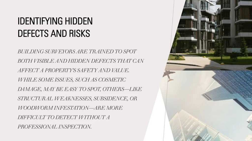 IDENTIFYING HIDDEN IDENTIFYING HIDDEN DEFECTS AND RISKS DEFECTS AND RISKS BUILDING SURVEYORS ARE TRAINED TO SPOT BOTH VISIBLE AND HIDDEN DEFECTS THAT CAN AFFECT A PROPERTY'S SAFETY AND V ALUE. WHILE SOME ISSUES, SUCH AS COSMETIC DAMAGE, MAY BE EASY TO SPOT, OTHERS—LIKE STRUCTURAL WEAKNESSES, SUBSIDENCE, OR WOODWORM INFESTATION—ARE MORE DIFFICULT TO DETECT WITHOUT A PROFESSIONAL INSPECTION.