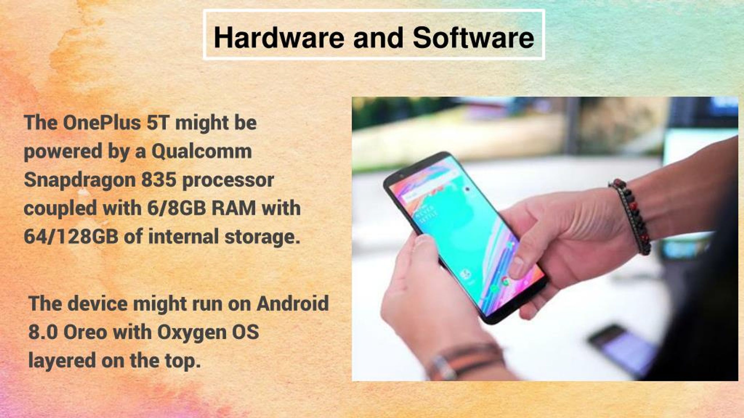 Hardware and Software The OnePlus 5T might be powered by a Qualcomm Snapdragon 835 processor coupled with 6/8GB RAM with 64/128GB of internal storage. The device might run on Android 8.0 Oreo with Oxygen OS layered on the top.
