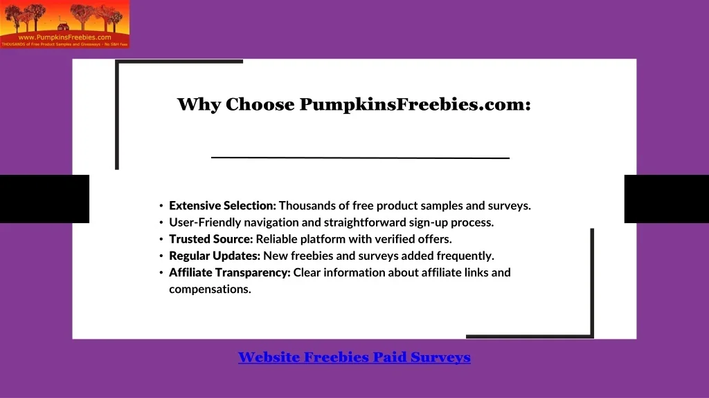 Why Choose PumpkinsFreebies.com: • Extensive Selection: Thousands of free product samples and surveys. • User-Friendly navigation and straightforward sign-up process. • Trusted Source: Reliable platform with verified offers. • Regular Updates: New freebies and surveys added frequently. • Affiliate Transparency: Clear information about affiliate links and compensations. Website Freebies Paid Surveys