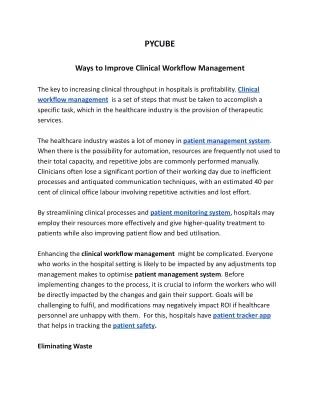 PYCUBE Ways to Improve Clinical Workflow Management The key to increasing clinical throughput in hospitals is profitability. Clinical workflow management is a set of steps that must be taken to accomplish a specific task, which in the healthcare industry is the provision of therapeutic services. The healthcare industry wastes a lot of money in patient management system. When there is the possibility for automation, resources are frequently not used to their total capacity, and repetitive jobs are commonly performed manually. Clinicians often lose a significant portion of their working day due to inefficient processes and antiquated communication techniques, with an estimated 40 per cent of clinical office labour involving repetitive activities and lost effort. By streamlining clinical processes and patient monitoring system, hospitals may employ their resources more effectively and give higher-quality treatment to patients while also improving patient flow and bed utilisation. Enhancing the clinical workflow management might be complicated. Everyone who works in the hospital setting is likely to be impacted by any adjustments top management makes to optimise patient management system. Before implementing changes to the process, it is crucial to inform the workers who will be directly impacted by the changes and gain their support. Goals will be challenging to fulfil, and modifications may negatively impact ROI if healthcare personnel are unhappy with them. For this, hospitals have patient tracker app that helps in tracking the patient safety. Eliminating Waste