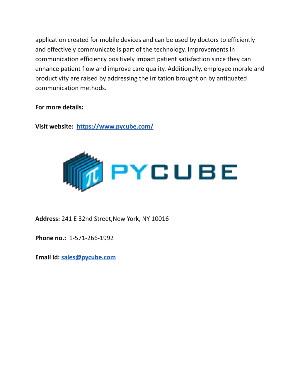 application created for mobile devices and can be used by doctors to efficiently and effectively communicate is part of the technology. Improvements in communication efficiency positively impact patient satisfaction since they can enhance patient flow and improve care quality. Additionally, employee morale and productivity are raised by addressing the irritation brought on by antiquated communication methods. For more details: Visit website: https://www.pycube.com/ Address: 241 E 32nd Street,New York, NY 10016 Phone no.: 1-571-266-1992 Email id: sales@pycube.com