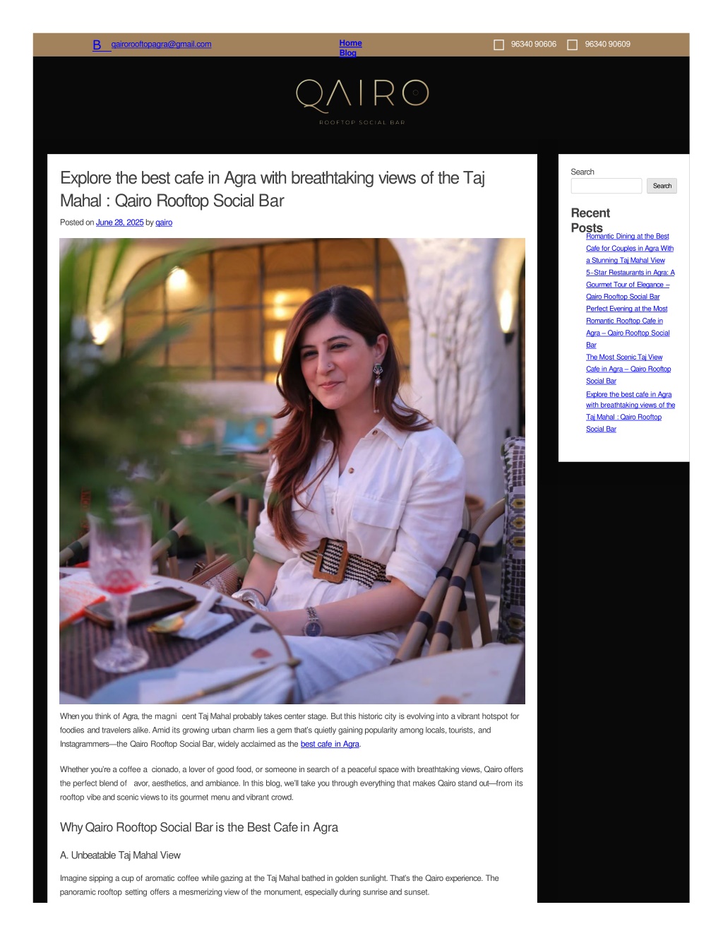NAME* EMAIL* WEBSITE SAVEMYNAME,EMAIL,ANDWEBSITEINTHISBROWSERFORTHENEXTTIMEICOMMENT. PostComment ContactUs 9634090609 9634090606 Address 4thFloor,HowardPlazaTheFern,FatehabadRd, BansalNagar,Tajganj,Agra,Uttar Pradesh282001 WelcometoQairoRooftopSocialBar,Agra’stopluxuryexperiencerestaurant.NestledintheheartofAgra,ourrooftopdiningvenueoffersaspectacularviewof theTajMahal.Whetheryou’reseekingaromanticdinner,avibrantsocialgathering,oracasualmealwithfriends. Bqairorooftopagra @gmail.com FollowUs OpeningHours MondaytoSunday12:00pm–1:00am Facebook %Instagram 0Whatsapp Copyright©2025,AllRightsReservedtoQairo.PoweredbyDialMeNow