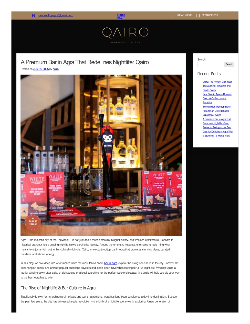 Bqairorooftopagra@gmail.com 9634090606 9634090609 HomeBlog APremiumBarinAgra ThatRedenesNightlife:Qairo PostedonJuly28,2025byqairo Search Search RecentPosts Qairo:The Perfect CafeNearTajMahalforTravelersandFood Lovers BestCafein Agra–DiscoverQairo:ACoffeeLover’sParadise TheUltimateRooftopBarInAgraforan UnforgettableExperience:Qairo APremiumBar inAgra ThatRedenesNightlife:QairoRomanticDiningatthe BestCafeforCouples in AgraWithaStunningTajMahalView Agra—themajestic cityoftheTajMahal— isnot just aboutmarblemarvels,Mughalhistory,andtimelessarchitecture.Beneathitshistorical grandeurliesabuzzing nightlifeslowlycarvingitsidentity.Amongtheemerginghotspots,onenameisredeningwhatitmeanstoenjoyanightoutinthisculturallyrichcity:Qairo,anelegantrooftopbarinAgrathatpromisesstunningviews,curatedcocktails,andvibrantenergy. Inthisblog,wedivedeepintowhatmakesQairothemosttalked-aboutbarinAgra,exploretherisingbarcultureinthecity,uncoverthebesthangoutzones,andanswerpopularquestionstravelersandlocals oftenhavewhenlookingforafun nightout.Whetheryou’reatouristwindingdownafteradayofsightseeingor alocal searchingfor theperfectweekendescape,thisguidewillhelpyou sipyourwaytothebestAgrahastooffer. TheRiseofNightlife&BarCultureinAgra Traditionallyknown for its architecturalheritageandtouristattractions,Agrahaslongbeenconsideredadaytimedestination.Butoverthepastfewyears,the cityhaswitnessedaquietrevolution—the birthofanightlifescene worthexploring.Anewgenerationof