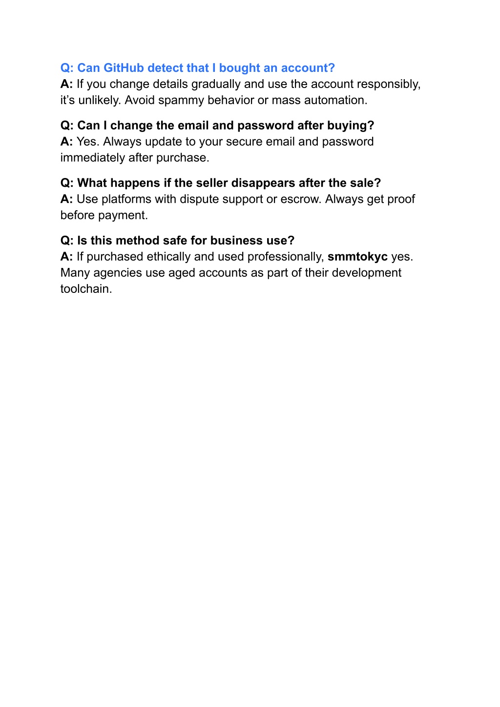 Q: Can GitHub detect that I bought an account? A: If you change details gradually and use the account responsibly, it’s unlikely. Avoid spammy behavior or mass automation. Q: Can I change the email and password after buying? A: Yes. Always update to your secure email and password immediately after purchase. Q: What happens if the seller disappears after the sale? A: Use platforms with dispute support or escrow. Always get proof before payment. Q: Is this method safe for business use? A: If purchased ethically and used professionally, smmtokyc yes. Many agencies use aged accounts as part of their development toolchain.