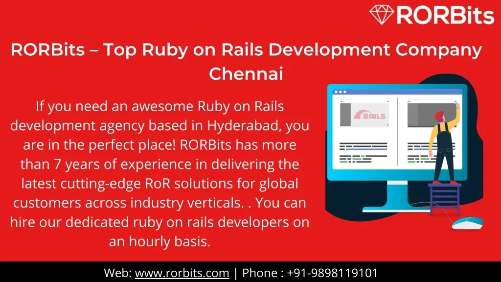 RORBits – Top Ruby on Rails Development Company Chennai If you need an awesome Ruby on Rails development agency based in Hyderabad, you are in the perfect place! RORBits has more than 7 years of experience in delivering the latest cutting-edge RoR solutions for global customers across industry verticals. . You can hire our dedicated ruby on rails developers on an hourly basis. Web: www.rorbits.com | Phone : +91-9898119101