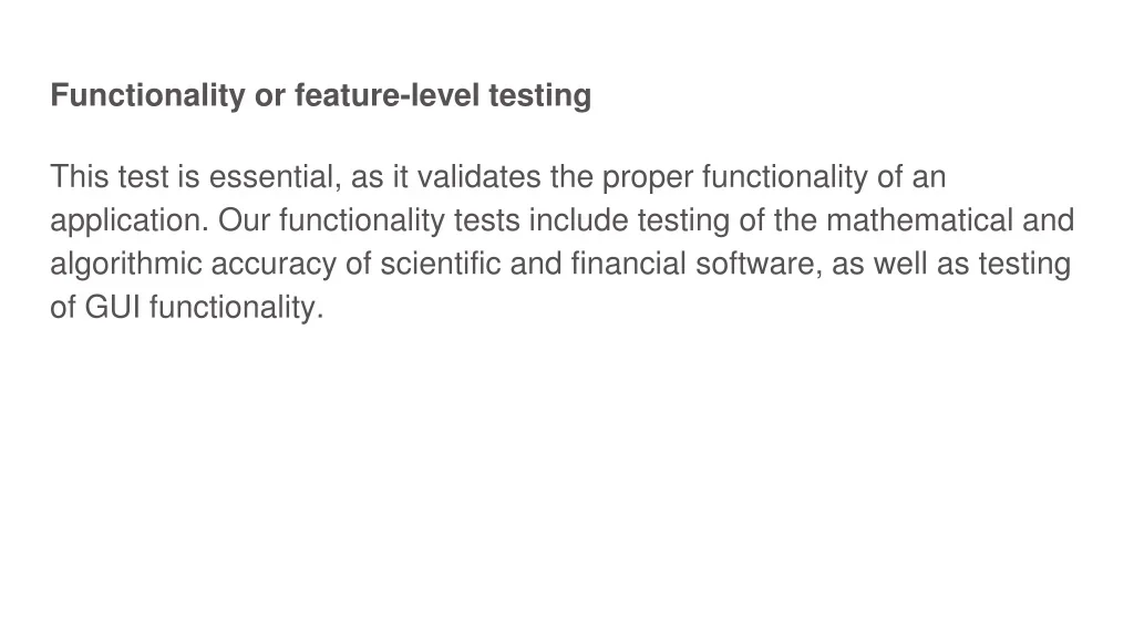 Functionality or feature-level testing This test is essential, as it validates the proper functionality of an application. Our functionality tests include testing of the mathematical and algorithmic accuracy of scientific and financial software, as well as testing of GUI functionality.