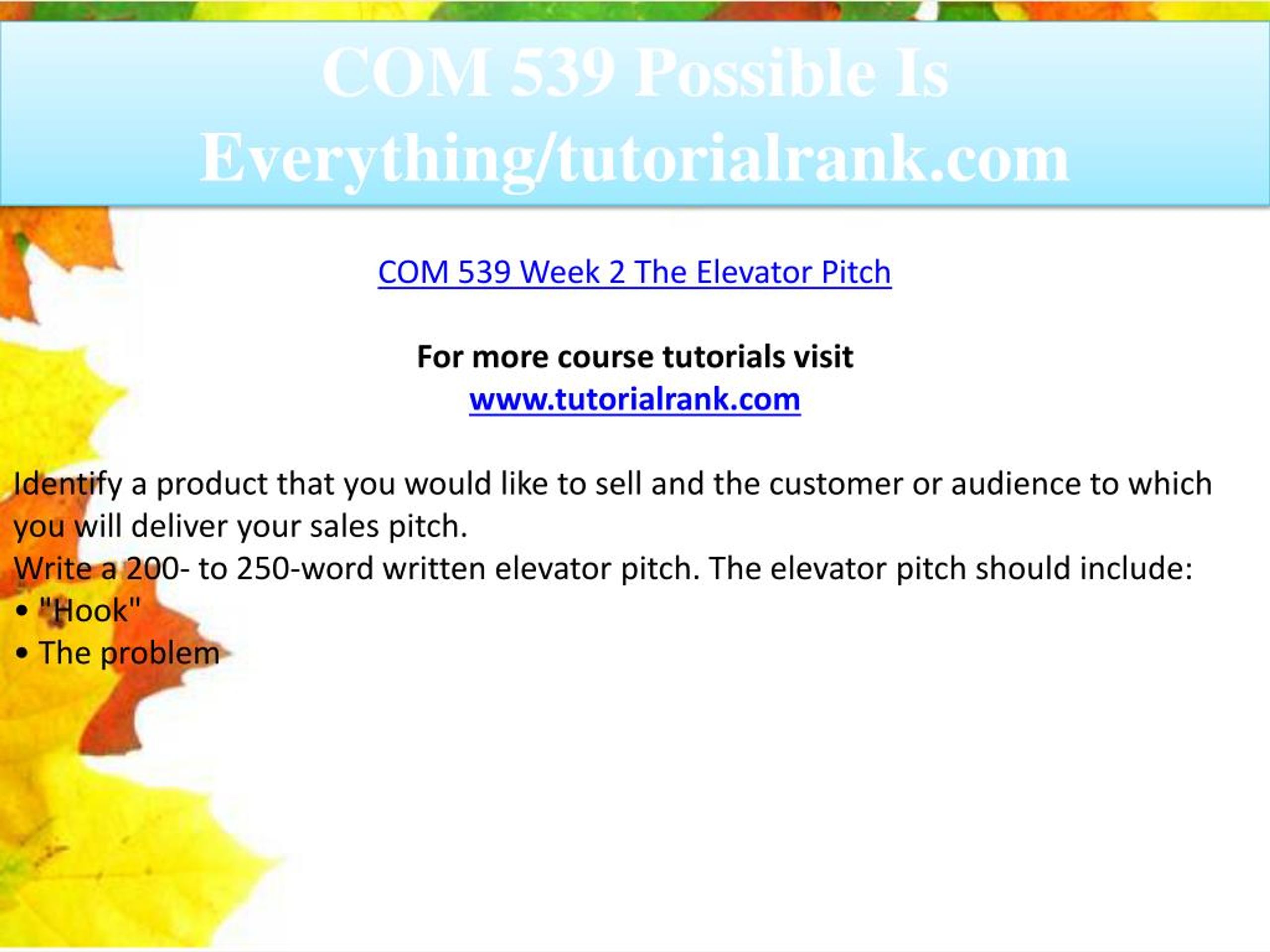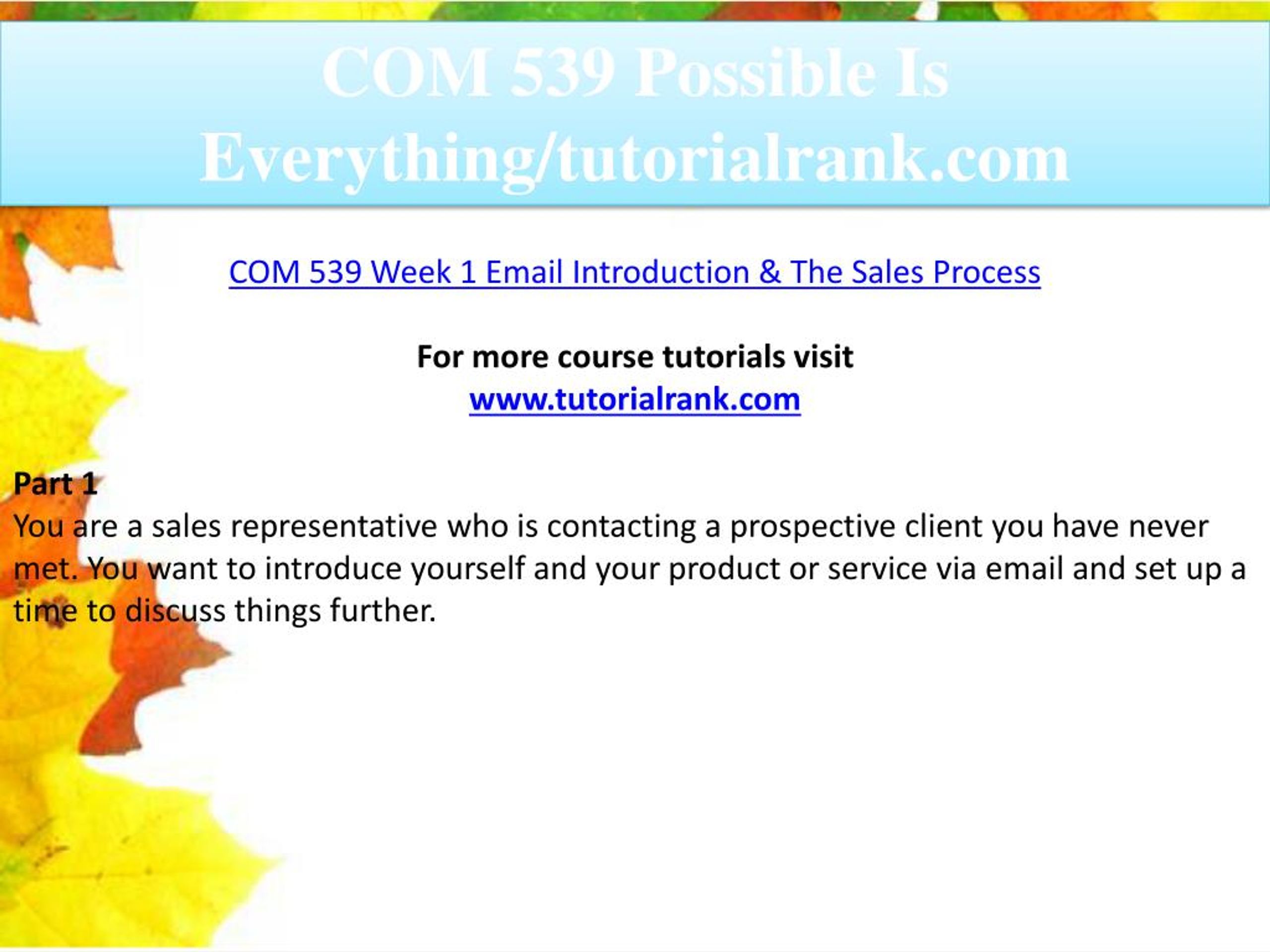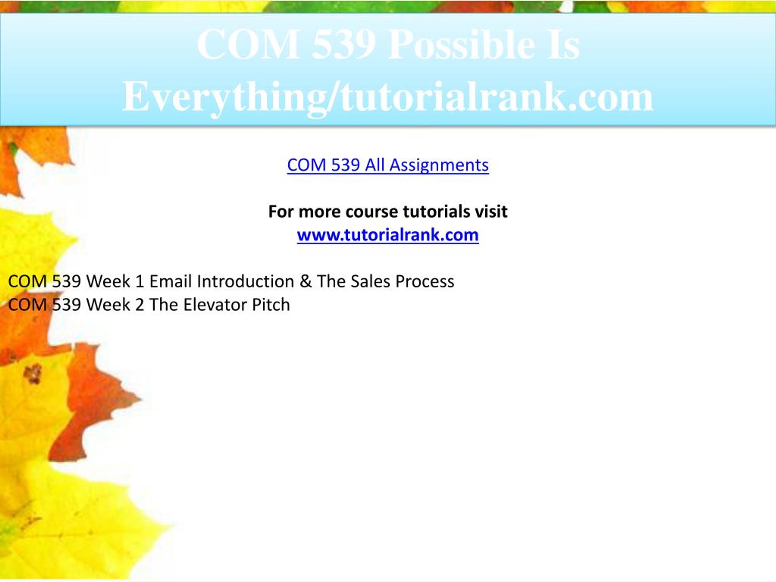 COM 539 Possible Is Everything/tutorialrank.com COM 539 All Assignments For more course tutorials visit www.tutorialrank.com COM 539 Week 1 Email Introduction & The Sales Process COM 539 Week 2 The Elevator Pitch