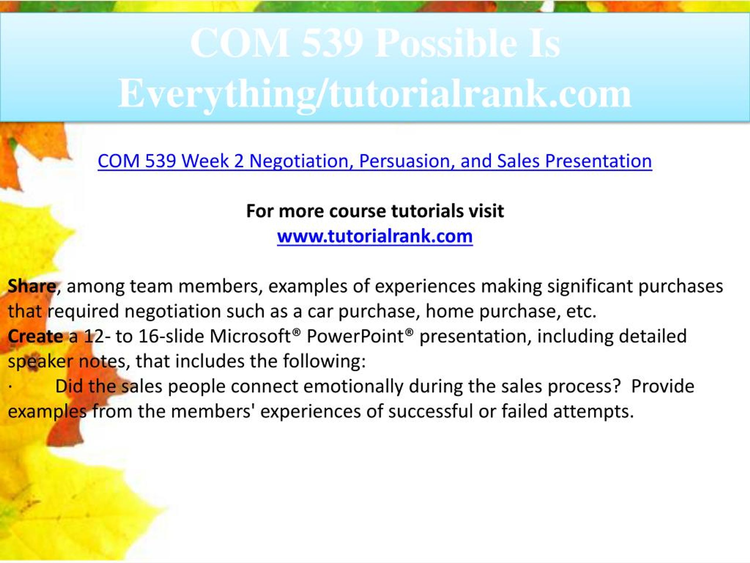 COM 539 Possible Is Everything/tutorialrank.com COM 539 Week 2 Negotiation, Persuasion, and Sales Presentation For more course tutorials visit www.tutorialrank.com Share, among team members, examples of experiences making significant purchases that required negotiation such as a car purchase, home purchase, etc. Create a 12- to 16-slide Microsoft® PowerPoint® presentation, including detailed speaker notes, that includes the following: · Did the sales people connect emotionally during the sales process? Provide examples from the members' experiences of successful or failed attempts.