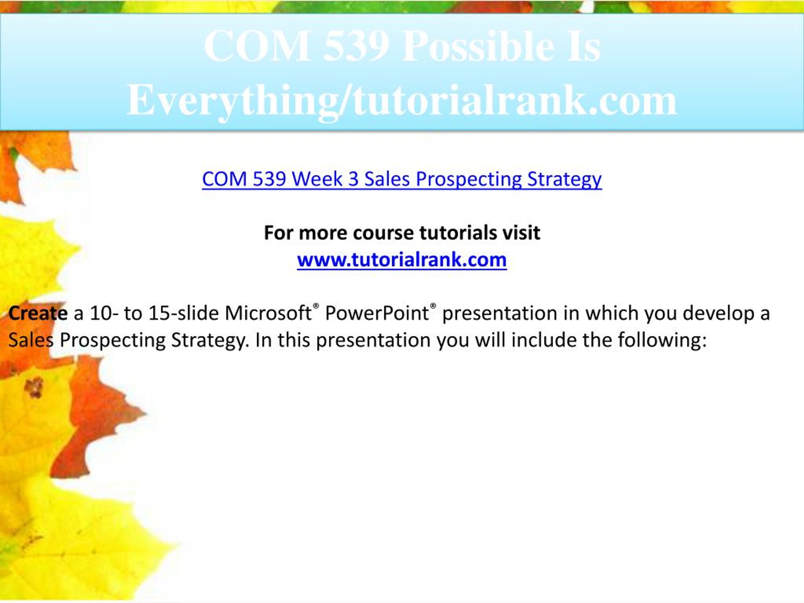 COM 539 Possible Is Everything/tutorialrank.com COM 539 Week 3 Sales Prospecting Strategy For more course tutorials visit www.tutorialrank.com Create a 10- to 15-slide Microsoft® PowerPoint® presentation in which you develop a Sales Prospecting Strategy. In this presentation you will include the following: