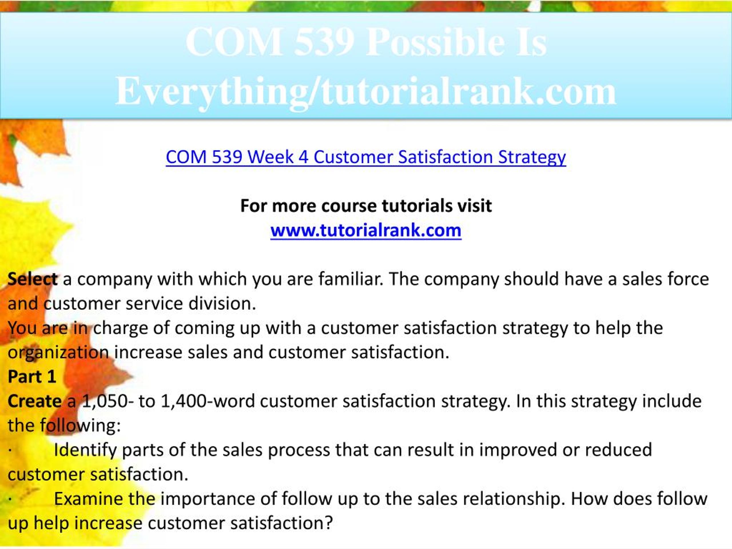 COM 539 Possible Is Everything/tutorialrank.com COM 539 Week 4 Customer Satisfaction Strategy For more course tutorials visit www.tutorialrank.com Select a company with which you are familiar. The company should have a sales force and customer service division. You are in charge of coming up with a customer satisfaction strategy to help the organization increase sales and customer satisfaction. Part 1 Create a 1,050- to 1,400-word customer satisfaction strategy. In this strategy include the following: · Identify parts of the sales process that can result in improved or reduced customer satisfaction. · Examine the importance of follow up to the sales relationship. How does follow up help increase customer satisfaction?