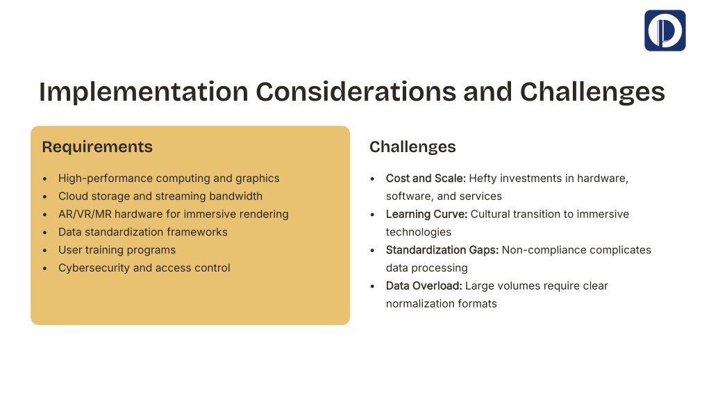 Implementation Considerations and Challenges Requirements Challenges • High-performance computing and graphics • Cloud storage and streaming bandwidth • AR/VR/MR hardware for immersive rendering • Data standardization frameworks • User training programs • Cybersecurity and access control • Cost and Scale: Hefty investments in hardware, software, and services • Learning Curve: Cultural transition to immersive technologies • Standardization Gaps: Non-compliance complicates data processing • Data Overload: Large volumes require clear normalization formats