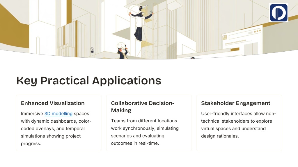 Key Practical Applications Enhanced Visualization Collaborative Decision-Making Stakeholder Engagement Immersive 3D modelling spaces with dynamic dashboards, color-coded overlays, and temporal simulations showing project progress. User-friendly interfaces allow non-technical stakeholders to explore virtual spaces and understand design rationales. Teams from different locations work synchronously, simulating scenarios and evaluating outcomes in real-time.