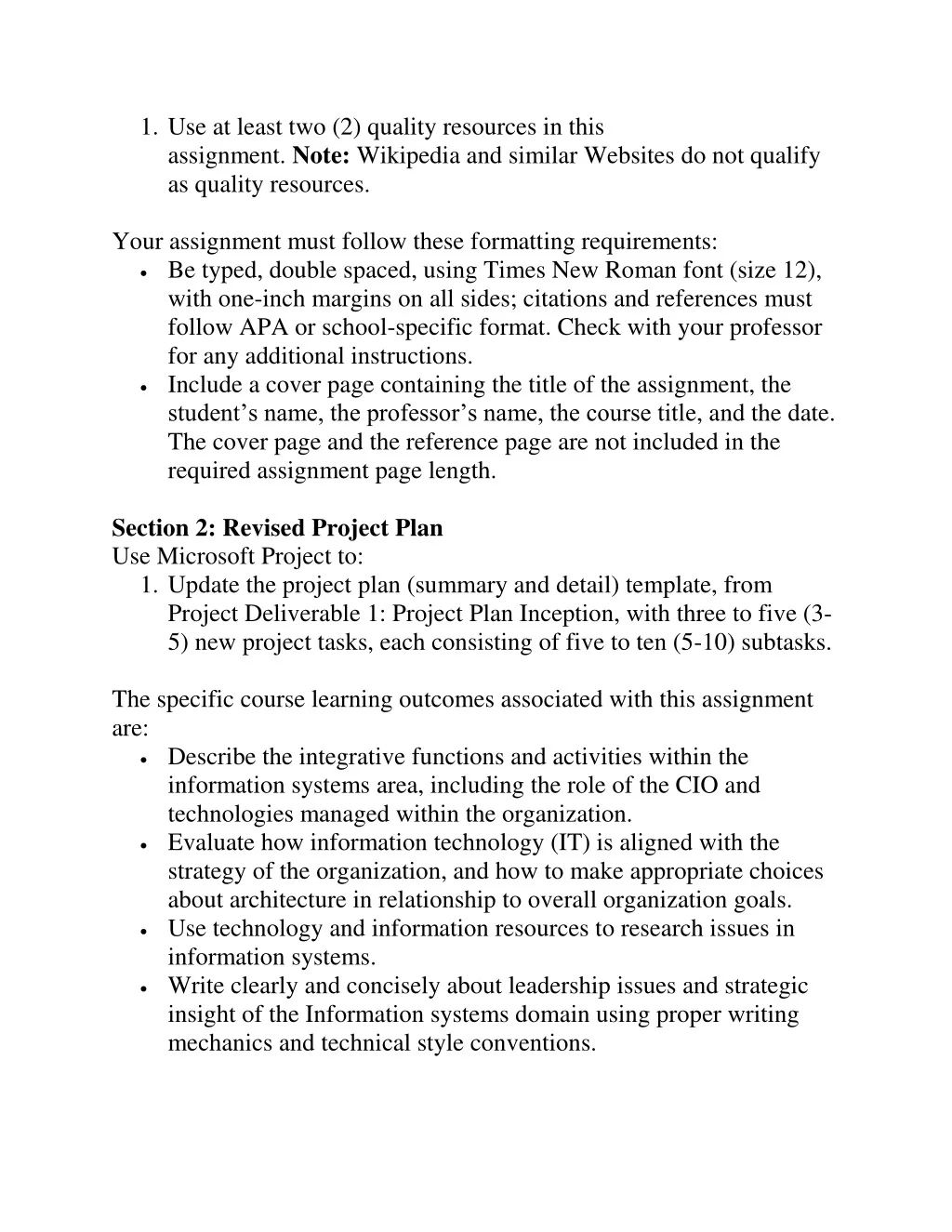 1.Use at least two (2) quality resources in this assignment. Note: Wikipedia and similar Websites do not qualify as quality resources. Your assignment must follow these formatting requirements: Be typed, double spaced, using Times New Roman font (size 12), with one-inch margins on all sides; citations and references must follow APA or school-specific format. Check with your professor for any additional instructions. Include a cover page containing the title of the assignment, the student’s name, the professor’s name, the course title, and the date. The cover page and the reference page are not included in the required assignment page length. Section 2: Revised Project Plan Use Microsoft Project to: 1.Update the project plan (summary and detail) template, from Project Deliverable 1: Project Plan Inception, with three to five (3- 5) new project tasks, each consisting of five to ten (5-10) subtasks. The specific course learning outcomes associated with this assignment are: Describe the integrative functions and activities within the information systems area, including the role of the CIO and technologies managed within the organization. Evaluate how information technology (IT) is aligned with the strategy of the organization, and how to make appropriate choices about architecture in relationship to overall organization goals. Use technology and information resources to research issues in information systems. Write clearly and concisely about leadership issues and strategic insight of the Information systems domain using proper writing mechanics and technical style conventions.