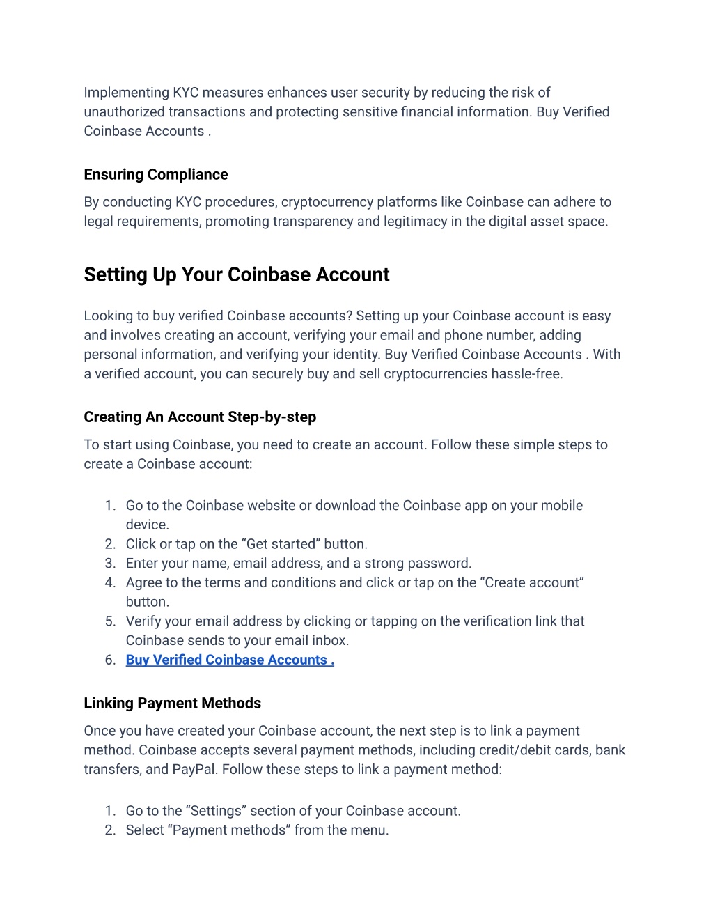 Implementing KYC measures enhances user security by reducing the risk of unauthorized transactions and protecting sensitive financial information. Buy Verified Coinbase Accounts . Ensuring Compliance By conducting KYC procedures, cryptocurrency platforms like Coinbase can adhere to legal requirements, promoting transparency and legitimacy in the digital asset space. Setting Up Your Coinbase Account Looking to buy verified Coinbase accounts? Setting up your Coinbase account is easy and involves creating an account, verifying your email and phone number, adding personal information, and verifying your identity. Buy Verified Coinbase Accounts . With a verified account, you can securely buy and sell cryptocurrencies hassle-free. Creating An Account Step-by-step To start using Coinbase, you need to create an account. Follow these simple steps to create a Coinbase account: 1. Go to the Coinbase website or download the Coinbase app on your mobile device. 2. Click or tap on the “Get started” button. 3. Enter your name, email address, and a strong password. 4. Agree to the terms and conditions and click or tap on the “Create account” button. 5. Verify your email address by clicking or tapping on the verification link that Coinbase sends to your email inbox. 6. Buy Verified Coinbase Accounts . Linking Payment Methods Once you have created your Coinbase account, the next step is to link a payment method. Coinbase accepts several payment methods, including credit/debit cards, bank transfers, and PayPal. Follow these steps to link a payment method: 1. Go to the “Settings” section of your Coinbase account. 2. Select “Payment methods” from the menu.