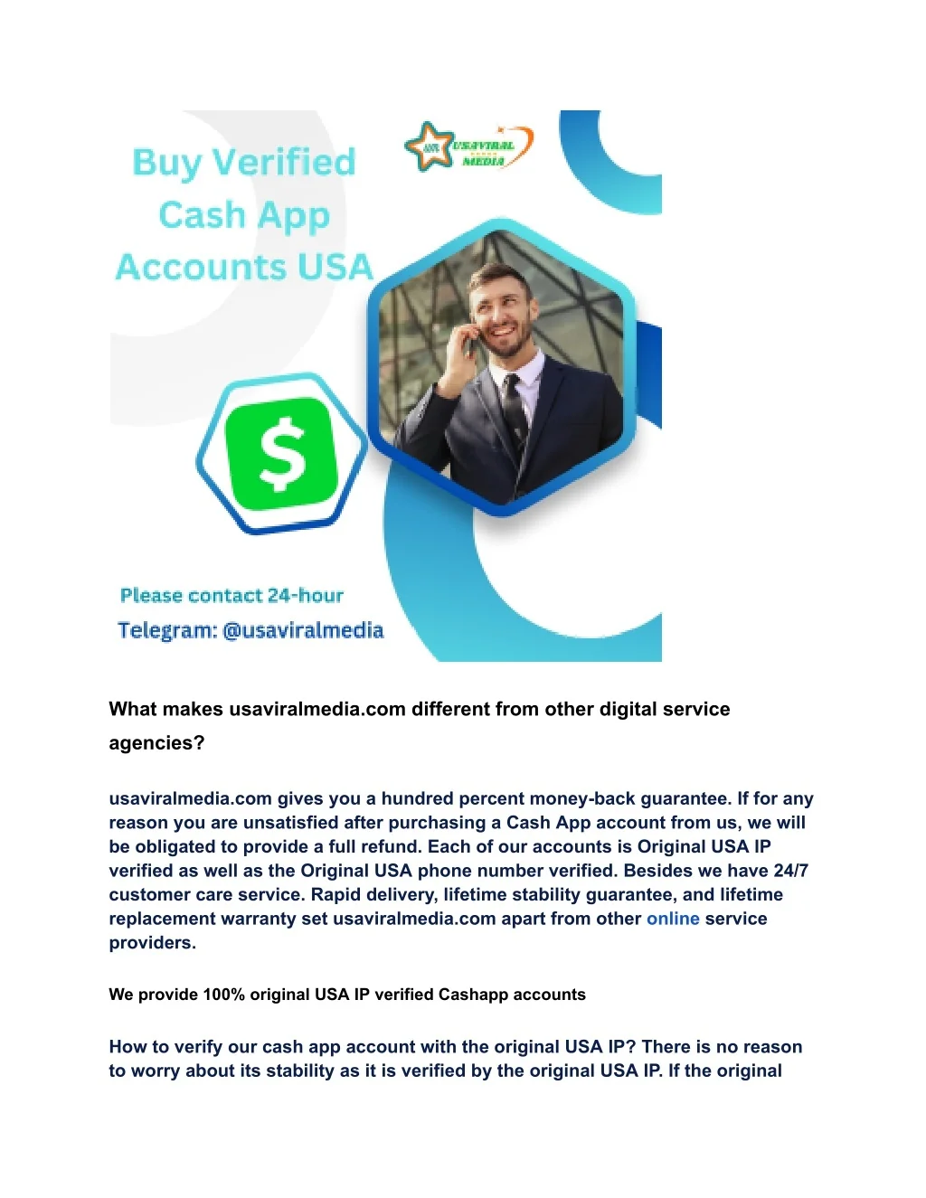 Please contact 24-hour Email: usaviralmedia@gmail.com Skype: usaviralmedia Telegram: @usaviralmedia WhatsApp: +1 (504) 534-5301 What are verified Cash App accounts USA? Cash App Accounts that are verified by an American IP address are called verified cash app accounts USA. Each of our cash app accounts is verified by an original authentic USA IP address as well as an original American phone number. So there is no reason to worry about purity and authenticity. But no matter where you buy verified cash app account from, you must buy an original USA IP and phone-verified account so you don’t have to worry about the stability of your account and getting benefits from the account. What are the benefits of Buy Verified Cash App Accounts? There are many benefits to buy verified Cash App account. It will help you step into the modern global economy as a consumer. Buying a Cash App account will help you enjoy all the facilities of the modern financial system. Some of the significant benefits to buy verified cash app accounts are mentioned below: ● Offering more security than other transaction channels. ● Easy to use. ● Trusted Platform for Insurance and Savings. ● Free credit and debit cards.