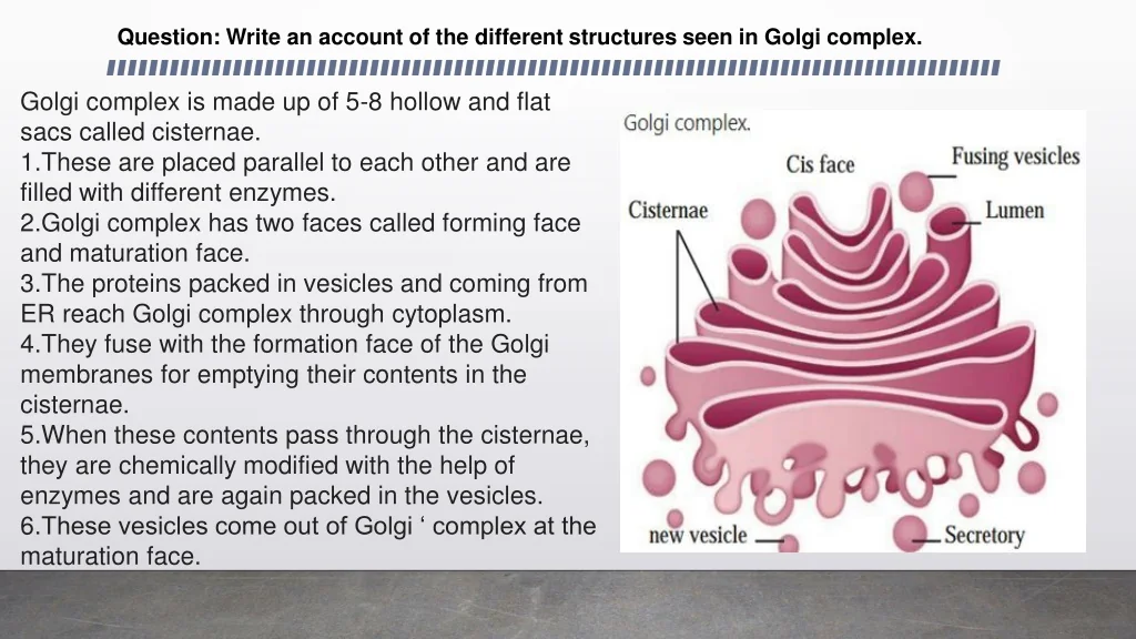 Golgi complex is made up of 5-8 hollow and flat sacs called cisternae. These are placed parallel to each other and are filled with different enzymes. Golgi complex has two faces called forming face and maturation face. The proteins packed in vesicles and coming from ER reach Golgi complex through cytoplasm. They fuse with the formation face of the Golgi membranes for emptying their contents in the cisternae. When these contents pass through the cisternae, they are chemically modified with the help of enzymes and are again packed in the vesicles. These vesicles come out of Golgi ‘ complex at the maturation face. Question: Write an account of the different structures seen in Golgi complex.