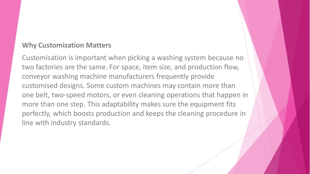 Why Customization Matters Customisation is important when picking a washing system because no two factories are the same. For space, item size, and production flow, conveyor washing machine manufacturers frequently provide customised designs. Some custom machines may contain more than one belt, two-speed motors, or even cleaning operations that happen in more than one step. This adaptability makes sure the equipment fits perfectly, which boosts production and keeps the cleaning procedure in line with industry standards.