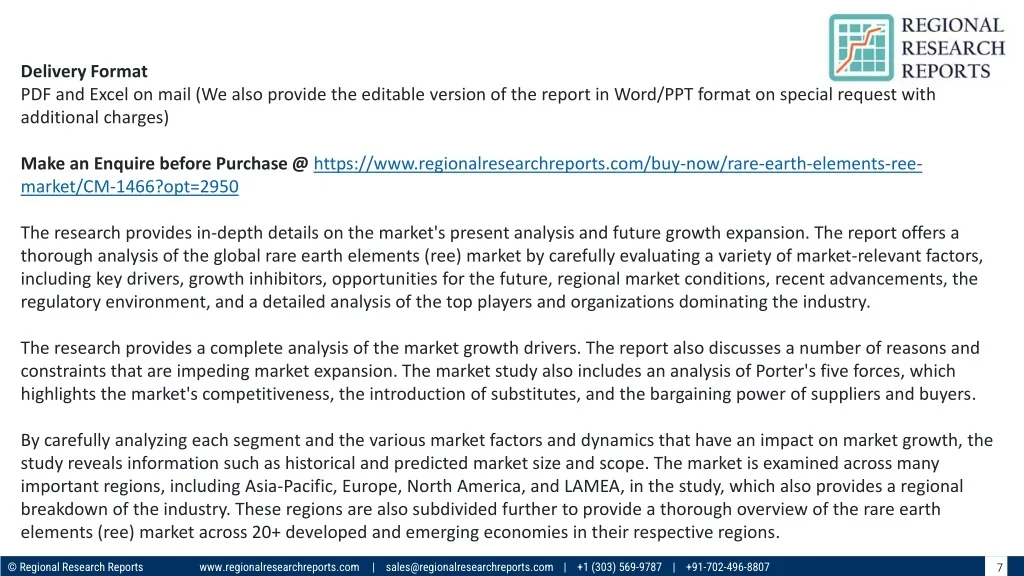 Delivery Format PDF and Excel on mail (We also provide the editable version of the report in Word/PPT format on special request with additional charges) Make an Enquire before Purchase @ https://www.regionalresearchreports.com/buy-now/rare-earth-elements-ree- market/CM-1466?opt=2950 The research provides in-depth details on the market's present analysis and future growth expansion. The report offers a thorough analysis of the global rare earth elements (ree) market by carefully evaluating a variety of market-relevant factors, including key drivers, growth inhibitors, opportunities for the future, regional market conditions, recent advancements, the regulatory environment, and a detailed analysis of the top players and organizations dominating the industry. The research provides a complete analysis of the market growth drivers. The report also discusses a number of reasons and constraints that are impeding market expansion. The market study also includes an analysis of Porter's five forces, which highlights the market's competitiveness, the introduction of substitutes, and the bargaining power of suppliers and buyers. By carefully analyzing each segment and the various market factors and dynamics that have an impact on market growth, the study reveals information such as historical and predicted market size and scope. The market is examined across many important regions, including Asia-Pacific, Europe, North America, and LAMEA, in the study, which also provides a regional breakdown of the industry. These regions are also subdivided further to provide a thorough overview of the rare earth elements (ree) market across 20+ developed and emerging economies in their respective regions. © Regional Research Reports www.regionalresearchreports.com | sales@regionalresearchreports.com | +1 (303) 569-9787 | +91-702-496-8807 7