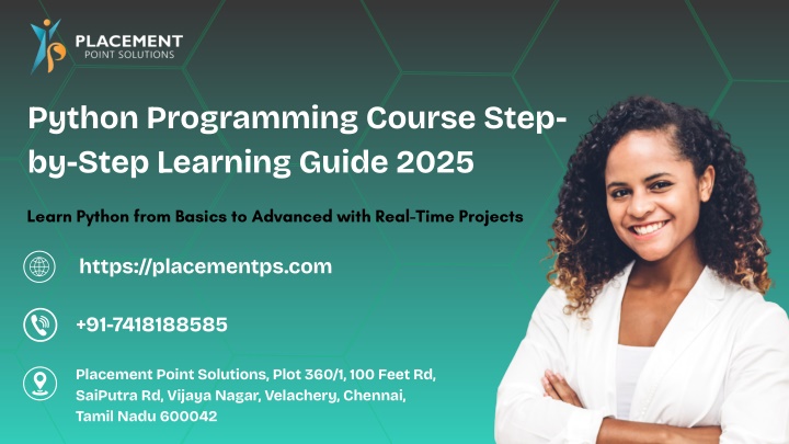 1. Python Programming Course Step- by-Step Learning Guide 2025 Learn Python from Basics to Advanced with Real-Time Projects https://placementps.com +91-7418188585 Placement Point Solutions, Plot 360/1, 100 Feet Rd, SaiPutra Rd, Vijaya Nagar, Velachery, Chennai, Tamil Nadu 600042