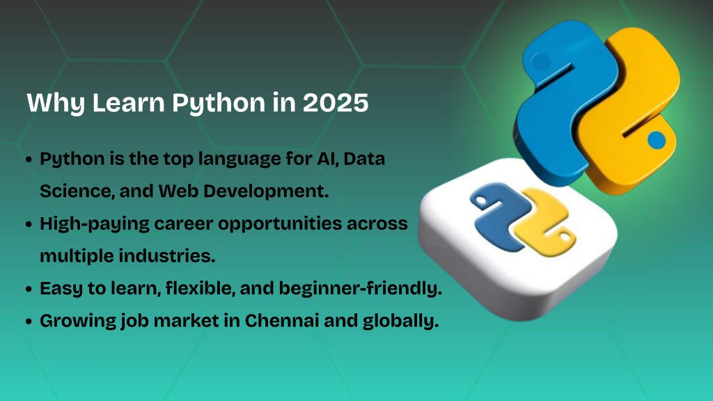 3. Why Learn Python in 2025 Python is the top language for AI, Data Science, and Web Development. High-paying career opportunities across multiple industries. Easy to learn, flexible, and beginner-friendly. Growing job market in Chennai and globally.