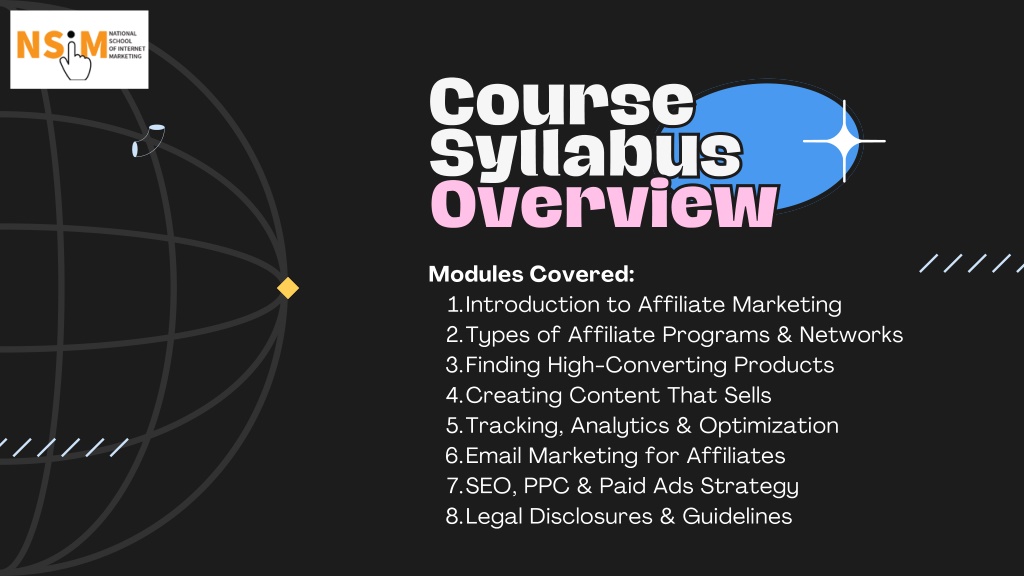 Course Syllabus Syllabus Overview Overview Course Modules Covered: 1.Introduction to Affiliate Marketing 2.Types of Affiliate Programs & Networks 3.Finding High-Converting Products 4.Creating Content That Sells 5.Tracking, Analytics & Optimization 6.Email Marketing for Affiliates 7.SEO, PPC & Paid Ads Strategy 8.Legal Disclosures & Guidelines