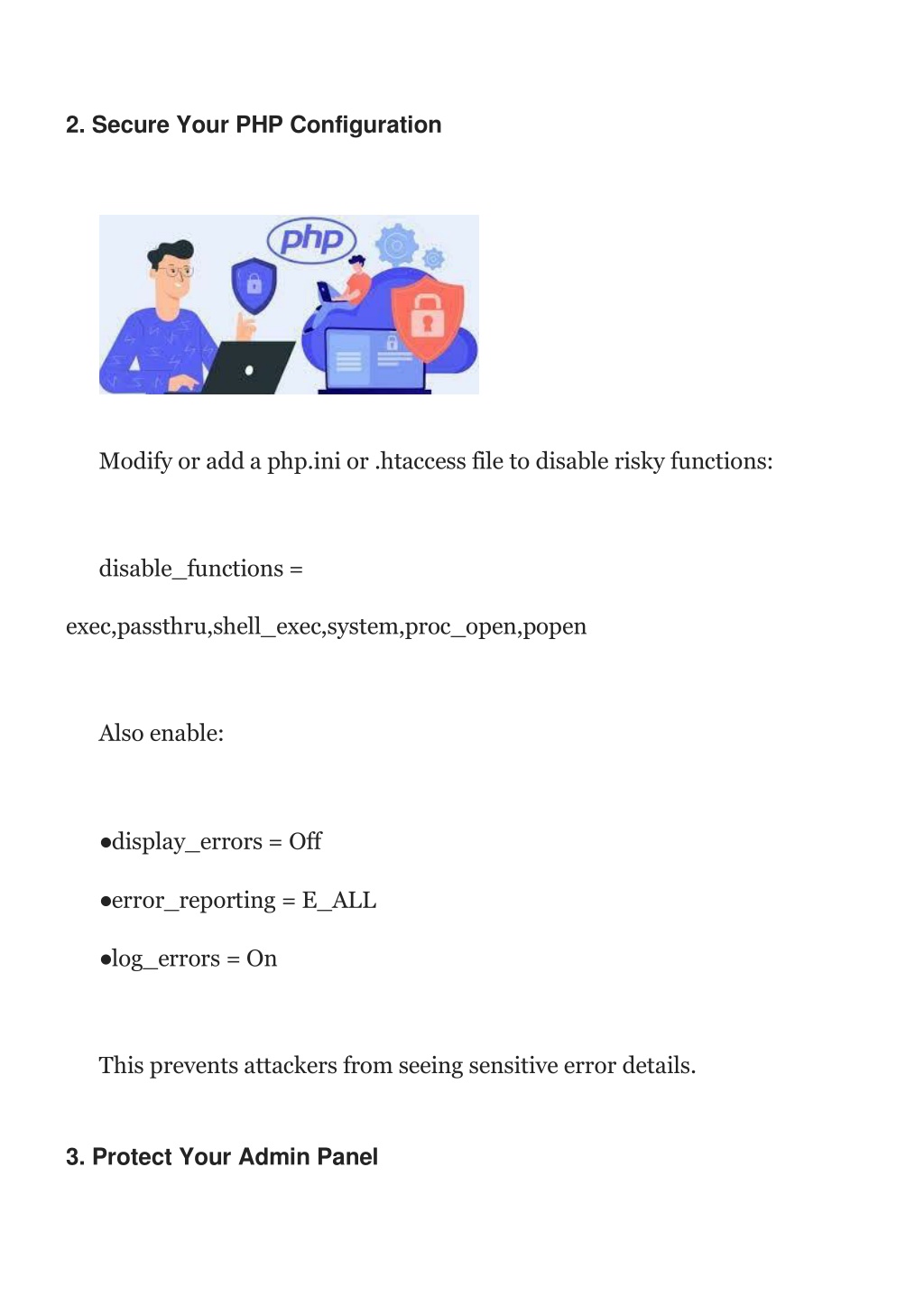 2. Secure Your PHP Configuration Modify or add a php.ini or .htaccess file to disable risky functions: disable_functions = exec,passthru,shell_exec,system,proc_open,popen Also enable: ●display_errors = Off ●error_reporting = E_ALL ●log_errors = On This prevents attackers from seeing sensitive error details. 3. Protect Your Admin Panel