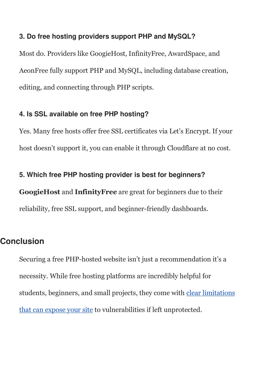 3. Do free hosting providers support PHP and MySQL? Most do. Providers like GoogieHost, InfinityFree, AwardSpace, and AeonFree fully support PHP and MySQL, including database creation, editing, and connecting through PHP scripts. 4. Is SSL available on free PHP hosting? Yes. Many free hosts offer free SSL certificates via Let’s Encrypt. If your host doesn’t support it, you can enable it through Cloudflare at no cost. 5. Which free PHP hosting provider is best for beginners? GoogieHost and InfinityFree are great for beginners due to their reliability, free SSL support, and beginner-friendly dashboards. Conclusion Securing a free PHP-hosted website isn’t just a recommendation it’s a necessity. While free hosting platforms are incredibly helpful for students, beginners, and small projects, they come with clear limitations that can expose your site to vulnerabilities if left unprotected.