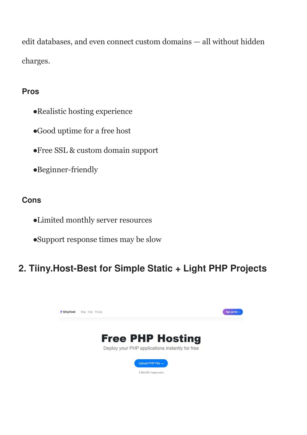 edit databases, and even connect custom domains — all without hidden charges. Pros ●Realistic hosting experience ●Good uptime for a free host ●Free SSL & custom domain support ●Beginner-friendly Cons ●Limited monthly server resources ●Support response times may be slow 2. Tiiny.Host-Best for Simple Static + Light PHP Projects