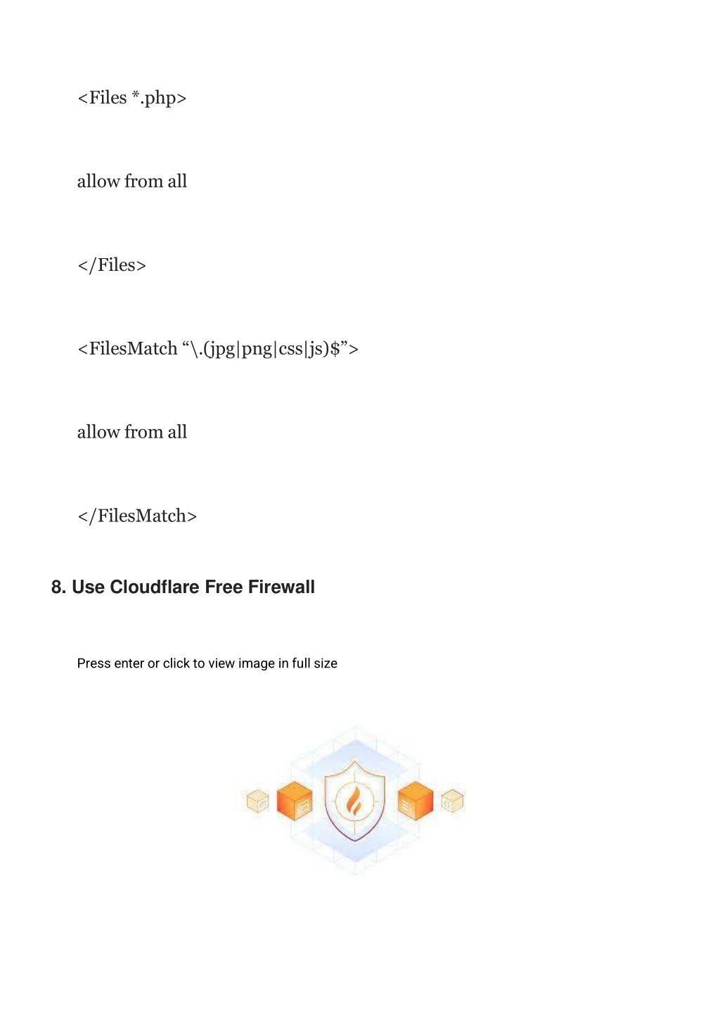 <Files *.php> allow from all </Files> <FilesMatch “\.(jpg|png|css|js)$”> allow from all </FilesMatch> 8. Use Cloudflare Free Firewall Press enter or click to view image in full size