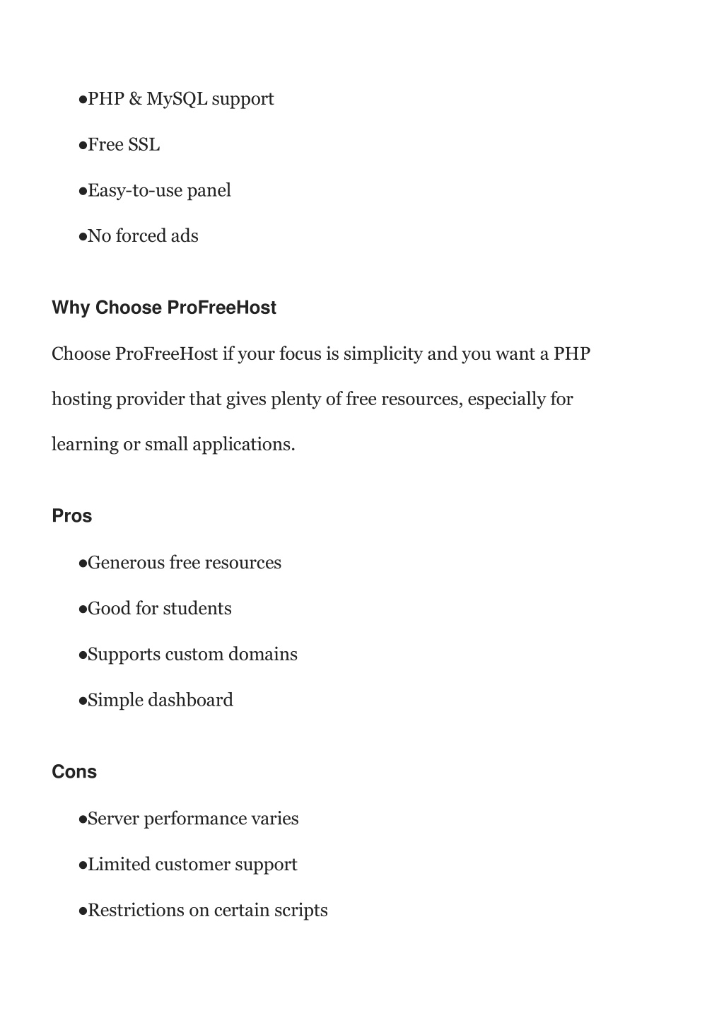 ●PHP & MySQL support ●Free SSL ●Easy-to-use panel ●No forced ads Why Choose ProFreeHost Choose ProFreeHost if your focus is simplicity and you want a PHP hosting provider that gives plenty of free resources, especially for learning or small applications. Pros ●Generous free resources ●Good for students ●Supports custom domains ●Simple dashboard Cons ●Server performance varies ●Limited customer support ●Restrictions on certain scripts