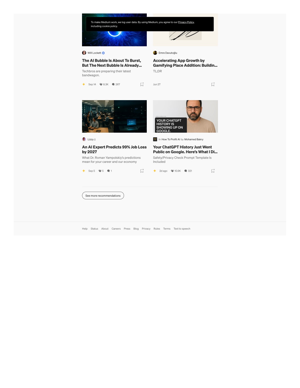 To make Medium work, we log user data. By using Medium, you agree to our Privacy Policy, including cookie policy. Will Lockett Emre Davutoğlu The AI Bubble Is About To Burst, But The Next Bubble Is Already… Techbros are preparing their latest bandwagon. Accelerating App Growth by Gamifying Place Addition: Buildin… TL;DR Sep 14 8.3K 267 Jun 27 Lizzy J. In How To Profit AI by Mohamed Bakry An AI Expert Predicts 99% Job Loss by 2027 What Dr. Roman Yampolskiy’s predictions mean for your career and our economy Your ChatGPT History Just Went Public on Google. Here’s What I Di… Safety/Privacy Check Prompt Template Is Included Sep 5 5 1 2d ago 10.9K 321 See more recommendations Help Status About Careers Press Blog Privacy Rules Terms Text to speech