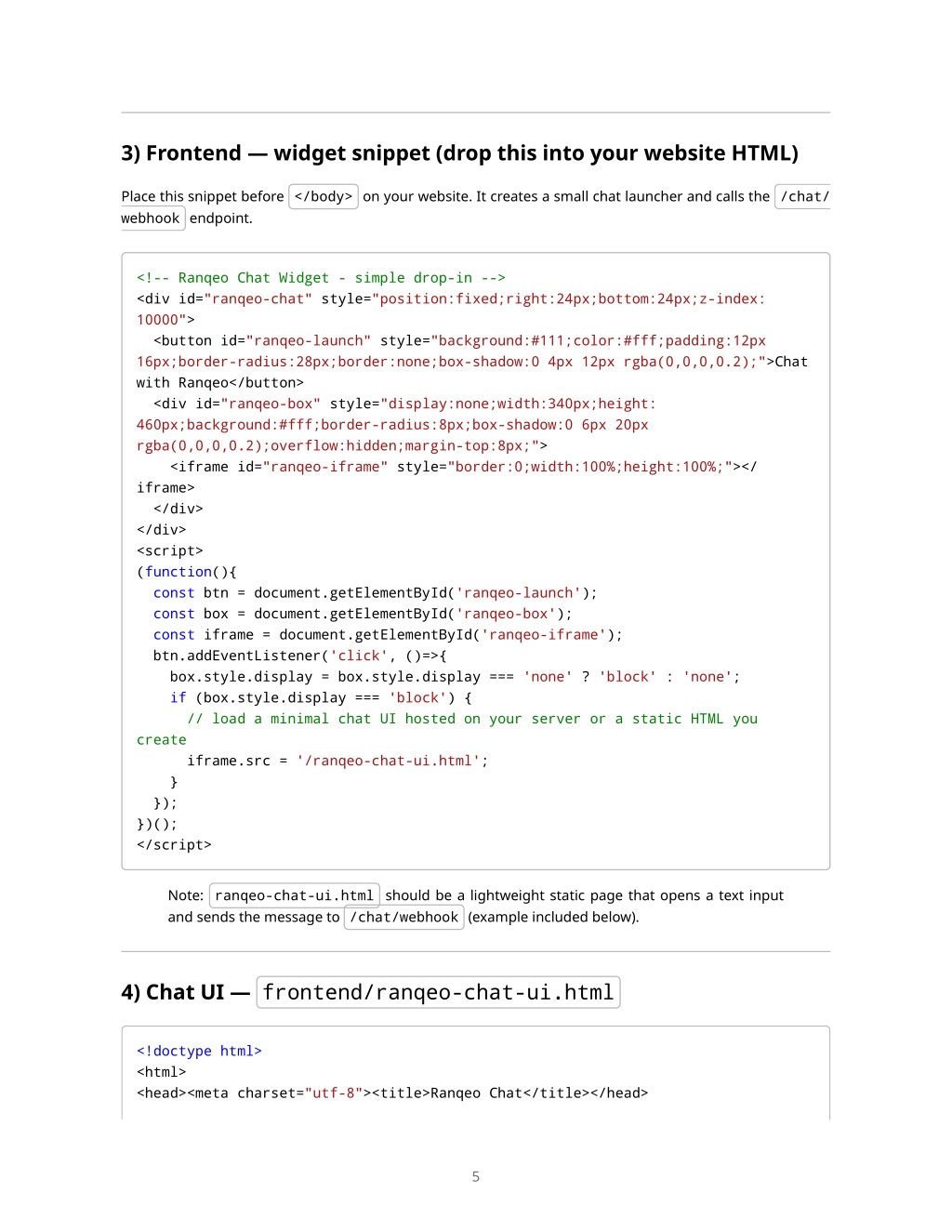 3) Frontend — widget snippet (drop this into your website HTML) Place this snippet before </body> on your website. It creates a small chat launcher and calls the /chat/ webhook endpoint. <!-- Ranqeo Chat Widget - simple drop-in --> <div id="ranqeo-chat" style="position:fixed;right:24px;bottom:24px;z-index: 10000"> <button id="ranqeo-launch" style="background:#111;color:#fff;padding:12px 16px;border-radius:28px;border:none;box-shadow:0 4px 12px rgba(0,0,0,0.2);">Chat with Ranqeo</button> <div id="ranqeo-box" style="display:none;width:340px;height: 460px;background:#fff;border-radius:8px;box-shadow:0 6px 20px rgba(0,0,0,0.2);overflow:hidden;margin-top:8px;"> <iframe id="ranqeo-iframe" style="border:0;width:100%;height:100%;"></ iframe> </div> </div> <script> (function(){ const btn = document.getElementById('ranqeo-launch'); const box = document.getElementById('ranqeo-box'); const iframe = document.getElementById('ranqeo-iframe'); btn.addEventListener('click', ()=>{ box.style.display = box.style.display === 'none' ? 'block' : 'none'; if (box.style.display === 'block') { // load a minimal chat UI hosted on your server or a static HTML you create iframe.src = '/ranqeo-chat-ui.html'; } }); })(); </script> Note: ranqeo-chat-ui.html should be a lightweight static page that opens a text input and sends the message to /chat/webhook (example included below). 4) Chat UI — frontend/ranqeo-chat-ui.html <!doctype html> <html> <head><meta charset="utf-8"><title>Ranqeo Chat</title></head> 5
